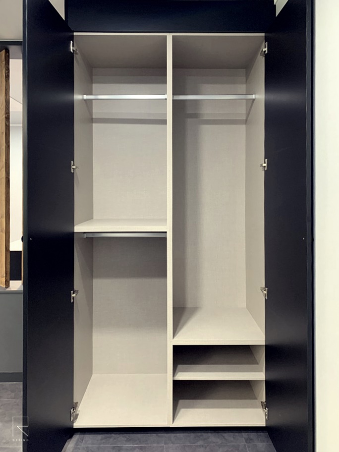 앞서 보신 파티션 옆쪽에 위치하고 있는 붙박이장 내부 모습입니다. 고객님이 편리하게 사용하실 수 있도록 맞춤 공간으로 채워 드렸습니다.
