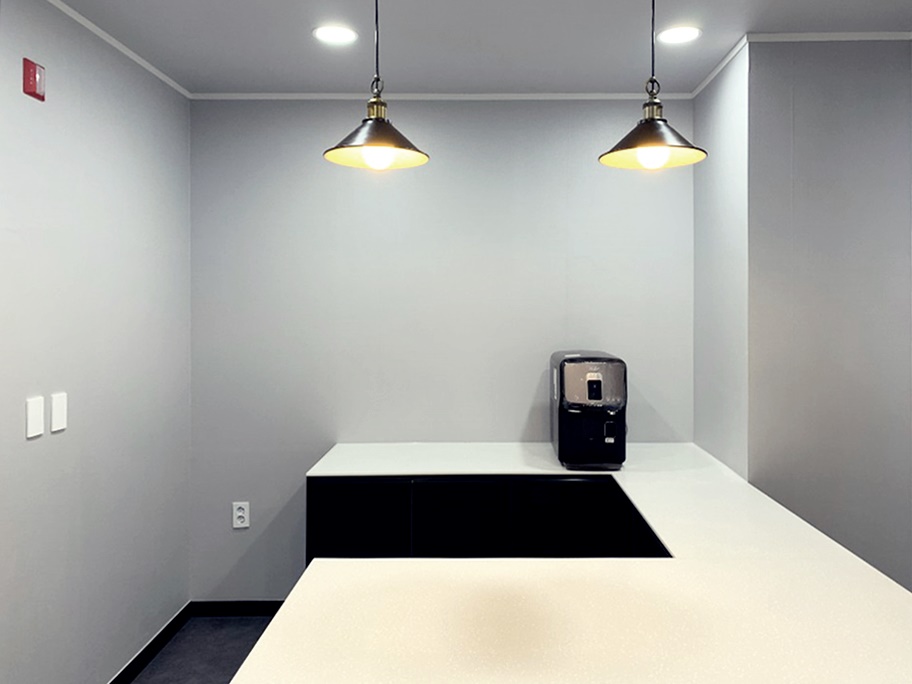마지막으로 카페테리아 공간의 세부 인테리어를 보여드리도록 하겠습니다. ㄷ자 구로로 시공하여 공간의 효율성을 높였으며 천장에는 깔끔한 디자인이 돋보이는 팬던트 조명을 시공하여 포인트를 주었습니다. 지금까지 심플 모던 그레이 인테리어로 완성한 회사 사무실 인테리어를 소개해 드렸습니다.