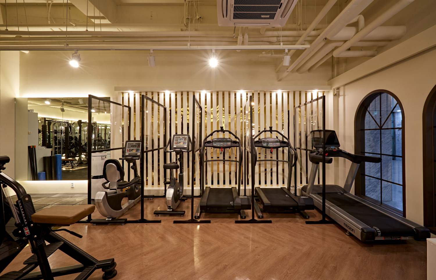 유산소 ZONE은 서로 자신의 운동에 집중할 수 있도록 유리 가벽을 세워두었는데요. 여기에서는 다른 동탄 기흥 여주 헬스장인테리어과 다르게 창 밖을 바라보는 구조가 아닌 자신만의 시간을 가지고, 보다 운동에 집중할 수 있는 환경을 만들었습니다. 그리고 거울이 아닌 세로 템바보드 형태의 가벽으로 심미적인 요소도 빼놓지 않았습니다.