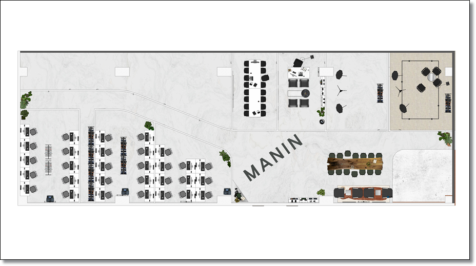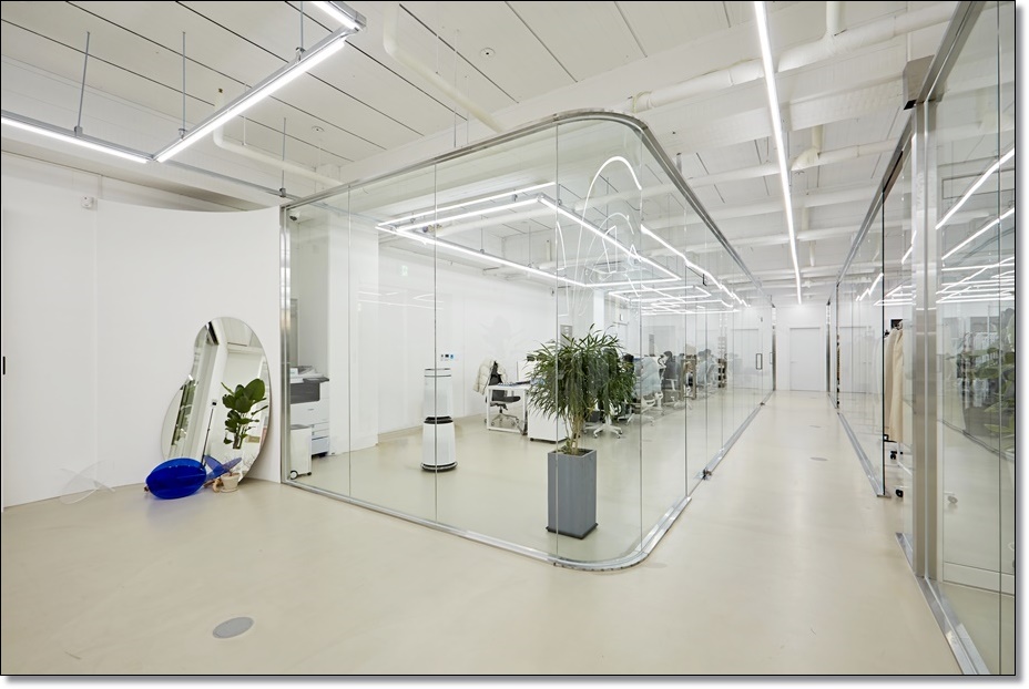 출입문을 지나면 로비가 나오는데요, 따로 인포메이션 공간을 두지 않고 방문객을 직접 맞이할 수 있도록 했고 정면에는 대표실과 관리팀을 두어 방문객을 관리할 수 있도록 했으며 입구측에 카페테리아를 조성해 대기를 하거나 직원들이 쉴 수 있는 공간이 되도록 했습니다.