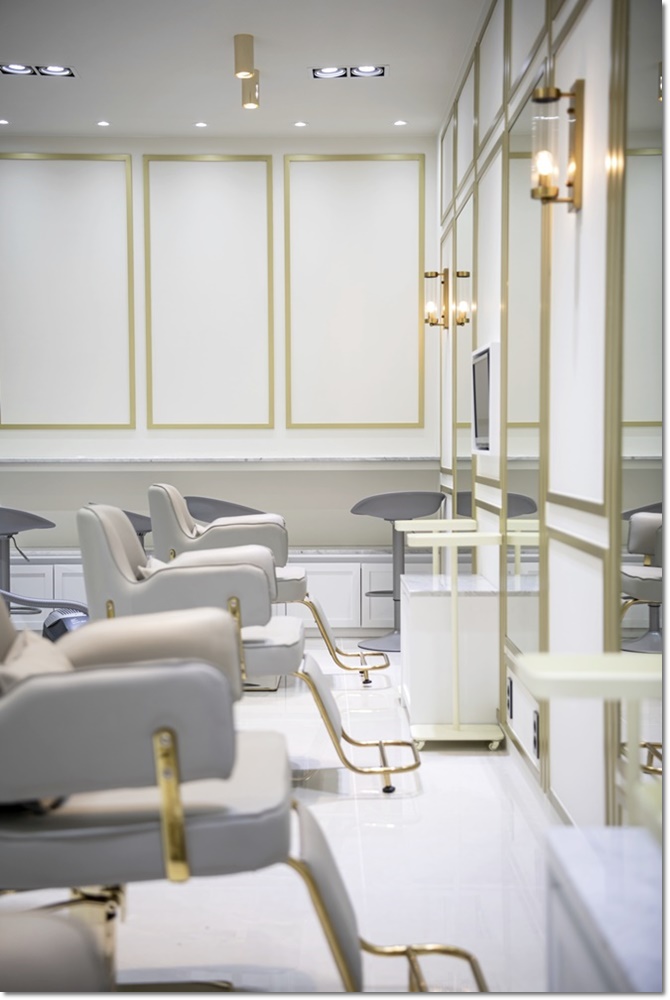 전체적인 작업공간의 전경입니다. 바닥부터 천장, 외벽이 전부 화이트톤의 색감을 이용하였기에 매우 깔끔한 색체를 가진 미용실이 만들어질 수가 있었습니다. 자칫하면 모던한 분위기만 연출이 될 뻔만 미용실이 우아한 유럽풍의 분위기를 낼 수 있었던 이유가 있다면 바로 금색의 몰딩을 이용해서 포인트를 살린 웨인스코팅과 조명이 있습니다. 가구 인테리어 또한 이런 포인트를 살려서 조금더 고급스러워 보이는 가구를 배치할 수 있었습니다.