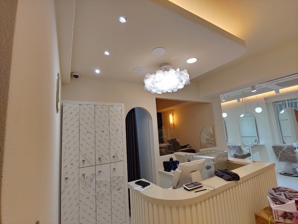 레일 조명은 테이블 위치나 동선에 맞춰 각도를 조절하거나 위치를 이동할 수 있으며 전구 종류도 교체할 수 있어 상업 공간에 많이 활용되고 있답니다. 천장 테두리를 따라 간접등 박스를 시공해 전구색 조명을 설치했고 경대 공간에는 팬던트형 조명을 설치해 염색 색깔이나 스타일링된 모습 등을 정확히 볼 수 있도록 해드렸습니다.