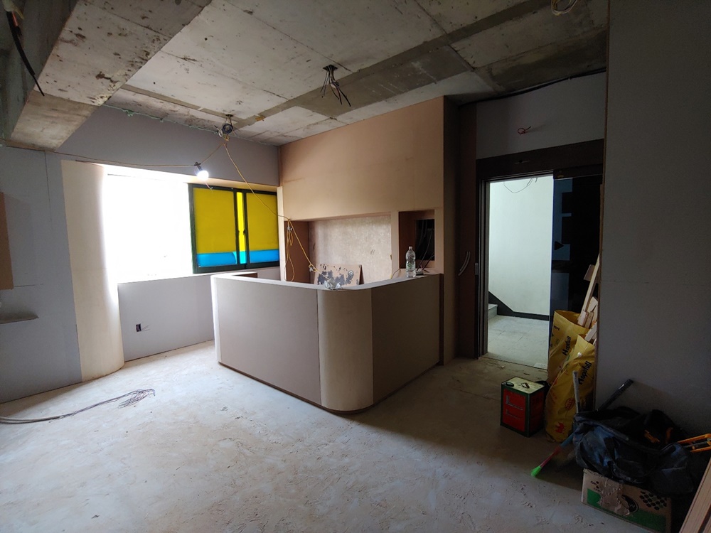 범계 성동구 신사동에 시공한 이 미용실인테리어는 경대를 벽면을 따라 배치했는데요, 보이는 목공 작업이 된 곳에 거울이 부착될 예정이랍니다.