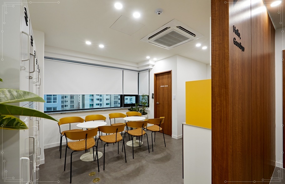 카페테리아입니다. 입구 바로 맞은편에 배치해 소음 발생을 최소화했고 진출입하면서 편리하게 이용할 수 있도록 했습니다. 우드패턴의 내부 파사드를 세워 시선을 차단해 자유롭게 쉬거나 식음료를 섭취할 수 있도록 했는데요, 이는 외부에서 봤을 때 지저분하거나 어수선한 모습을 가릴 수 있어 도움이 되죠. 상하부장을 시공해 수납력을 높였고 작은 가전제품을 둘 수 있도록 했으며 개인 사물함을 배치해 사용성과 편의성을 높였습니다.