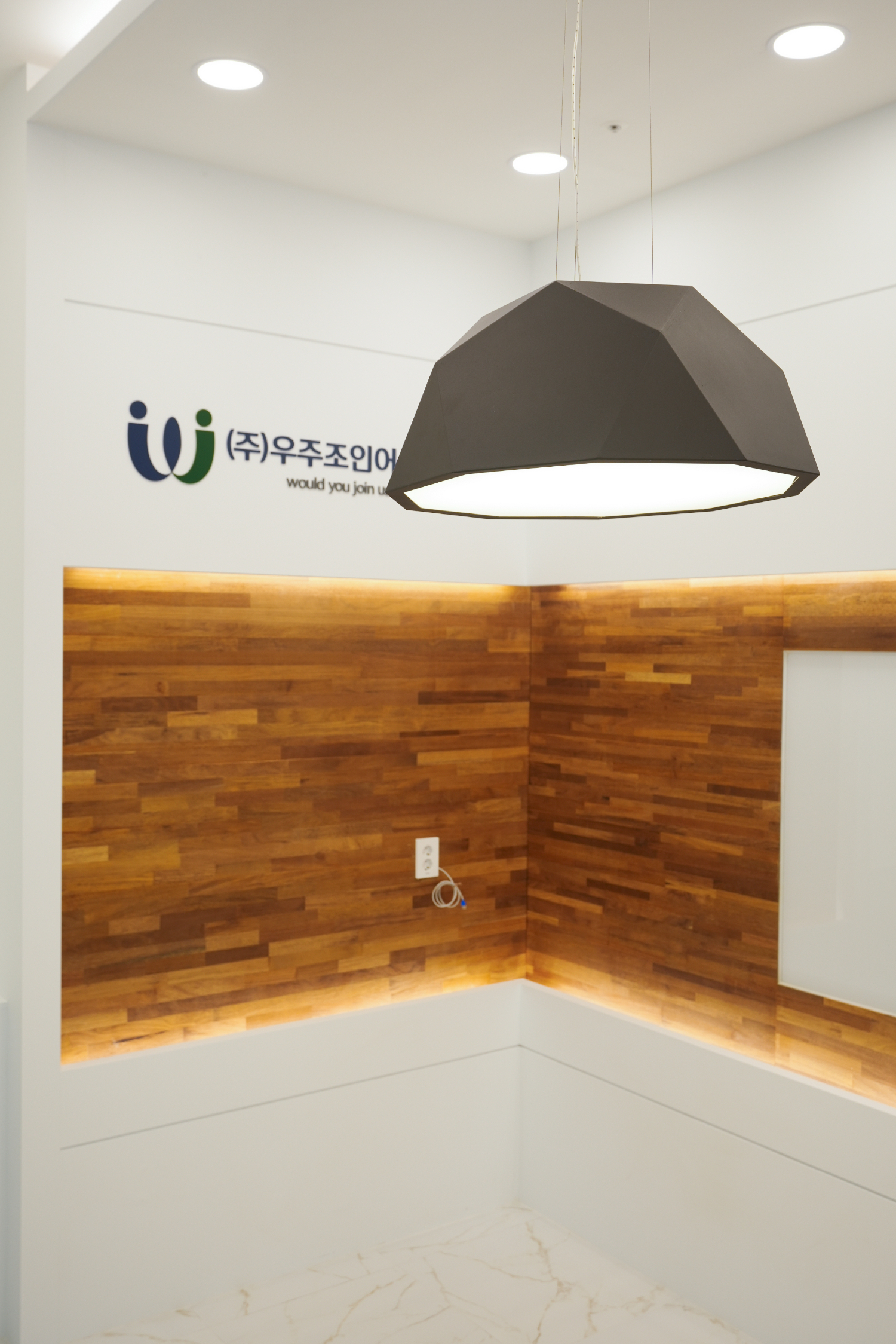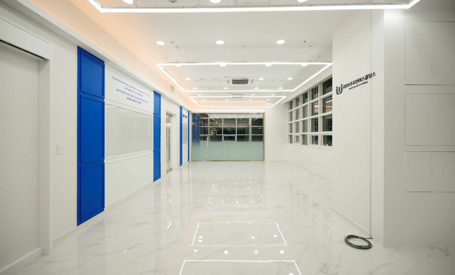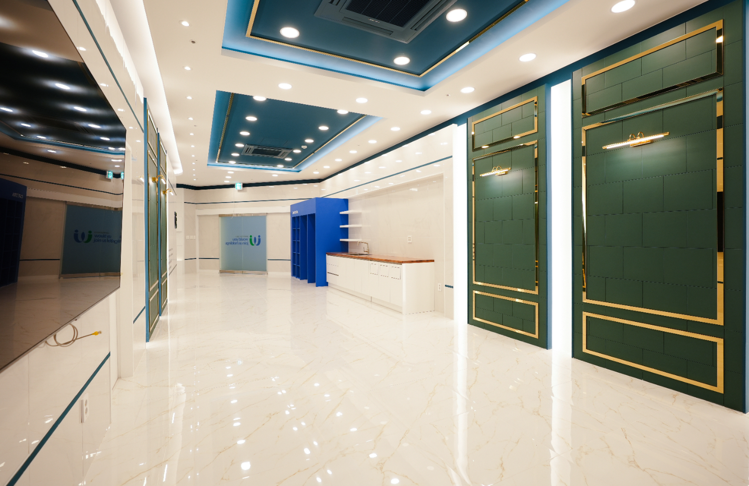 화이트, 블루, 그린, 골드컬러의 조화로 차분하면서 고급진 느낌을 주었고 회사의 로고와 업체명 위에 조명을 달아 더욱 돋보이게 포인트를 주었습니다. 그리고 간접조명을 적용하여 업체명을 볼때에 가독성을 높일 수 있는 효과를 주었습니다.