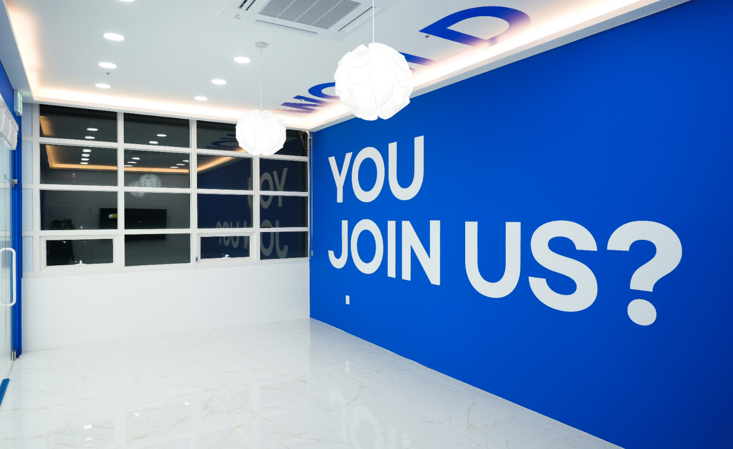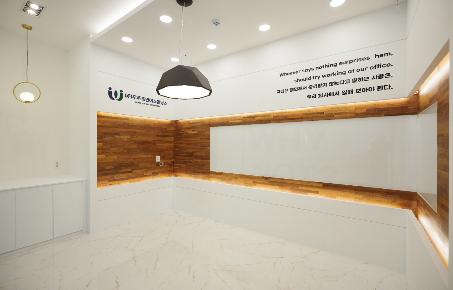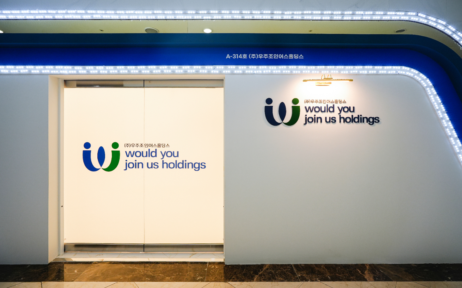 화이트, 블루, 그린, 골드컬러의 조화로 차분하면서 고급진 느낌을 주었고 회사의 로고와 업체명 위에 조명을 달아 더욱 돋보이게 포인트를 주었습니다. 그리고 간접조명을 적용하여 업체명을 볼때에 가독성을 높일 수 있는 효과를 주었습니다.