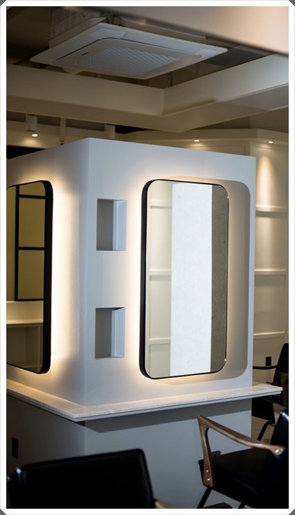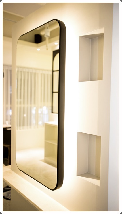 시공 작업을 마무리하고 완성된 최종 사진입니다. 작업 공간의 경우에는 ISO 도안과 일치하게 기둥이 있는 작업 공간과 외벽이 있는 작업 공간을 나누어 보았으며 기둥이 있는 작업 공간과 같은 경우에는 거울이 있는 부분에 조명을 주어서 작업을 받는 고객들이 한층 더 선명하게 받을 수 있도록 구성을 시도하였으며 외벽이 있는 작업 공간은 거울 뒤에 조명을 두는 것이 아닌 천장에 조명을 두어 배치를 해보았습니다.