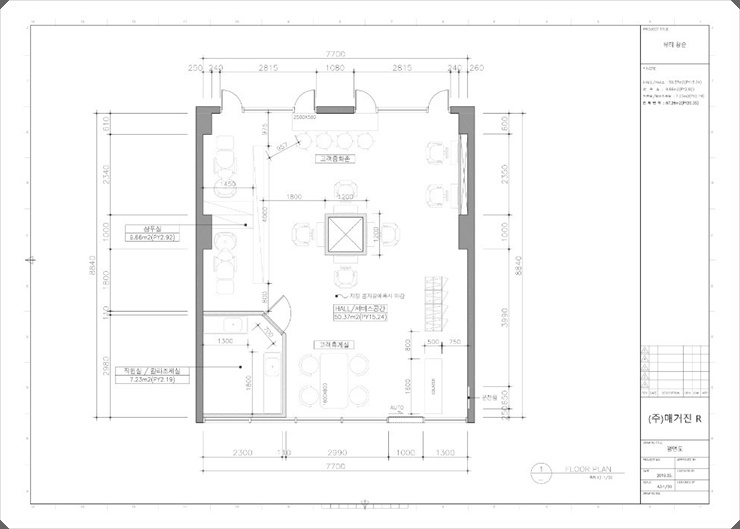 사무실 인테리어의 도안의 모습입니다. 소규모의 헤어샵 매장이지만 저희만의 유용한 공간 배치를 통해서 시공 작업을 진행해드렸으며 이를 참고로 하여 작업을 시도해보았습니다.