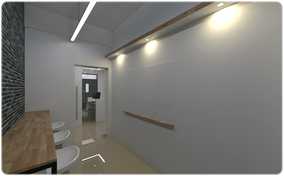 실 내부도 화이트로 통일성을 주었고 천장에 스퀘어 라인 조명을 달아 구석까지 비출 수 있도록 했으며 가구는 진한 우드톤을 적용해 중후하면서 무게감있는 공간으로 조성하면 안정감과 신뢰감을 느낄 수 있습니다.