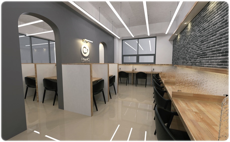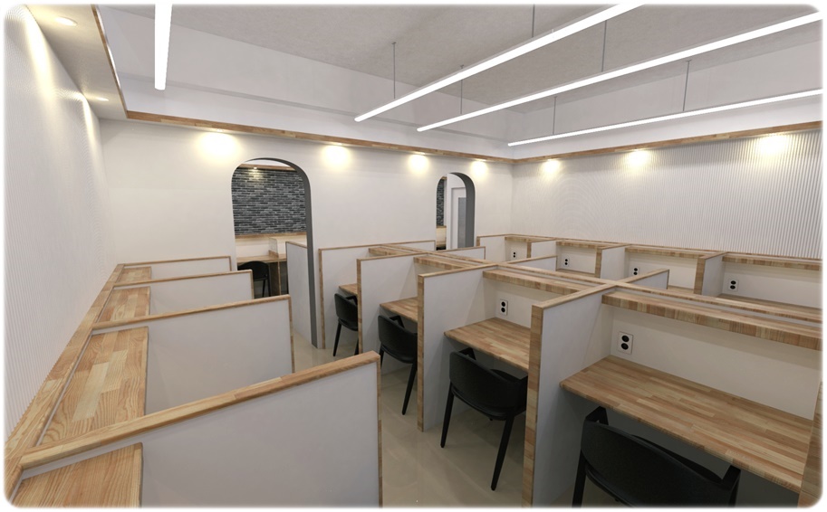자율학습실로 활용할 수 있는 공간입니다. 화이트, 진그레이를 적용해 깔끔하고 세련된 공간으로 디자인했고 바닥은 베이지 계열의 빈티지 노출로 마감하면 천장 조명이 반사되어 더욱 밝고 화사한 공간이 될 수 있습니다. 천장 조명을 라인 조명을 적당한 간격으로 시공해 벽면에까지 충분한 조도가 확보될 수 있도록 했고 파벽돌을 적용한 포인트 벽면을 계획해 공간적 통일성을 주었습니다.