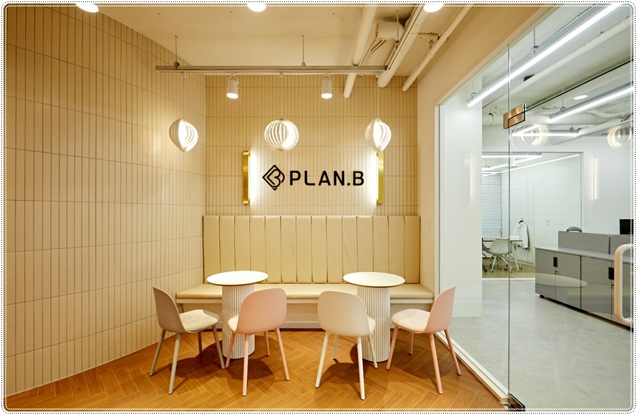 직사각형의 평면이어서 레이아웃을 명확히 나눌 수 있지만 부드러우면서 아늑한 분위기를 원하셔서 로비 공간에 곡선형 가벽을 계획했고 업무를 보는 사무공간은 브론즈 컬러의 유리 가벽을 적용해 제안을 드렸습니다. 평면설계도와 함께 3D 이미지도 함께 제공을 해드려 완공된 모습을 미리 확인할 수 있도록 도와드렸는데요, 이번 포스팅에서는 완공된 현장을 바로 공개해드릴게요.