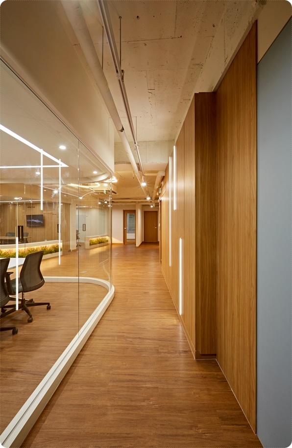 외부 파사드입니다. 엘리베이터 앞 공용공간의 벽면을 디자인해 내부 인테리어와 연계하면서 그 곳에서부터 회사가 시작된다는 인식을 주었습니다. 우드 필름지로 시공한 알판을 이중으로 시공하고 후면에 따뜻한 색감의 간접조명을 더해 은은한 분위기를 만들었습니다. 우드톤 알판에는 스펠링 사인물을 제작해 업체명과 로고로 시공해 포인트를 주면서 가독성을 높였는데요, 이를 통해 홍보 및 마케팅의 효과도 높일 수 있답니다.