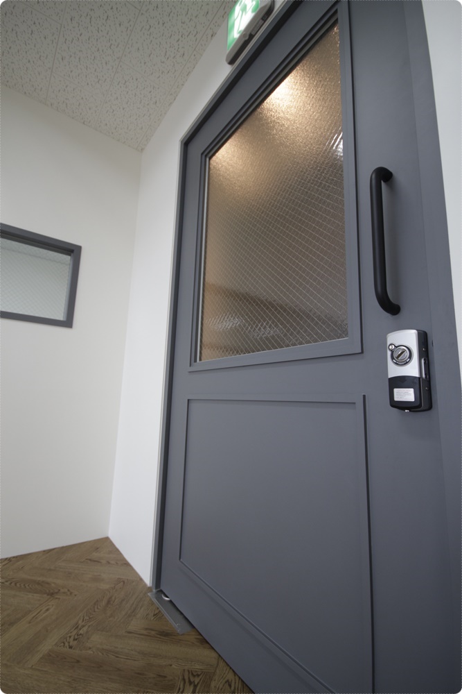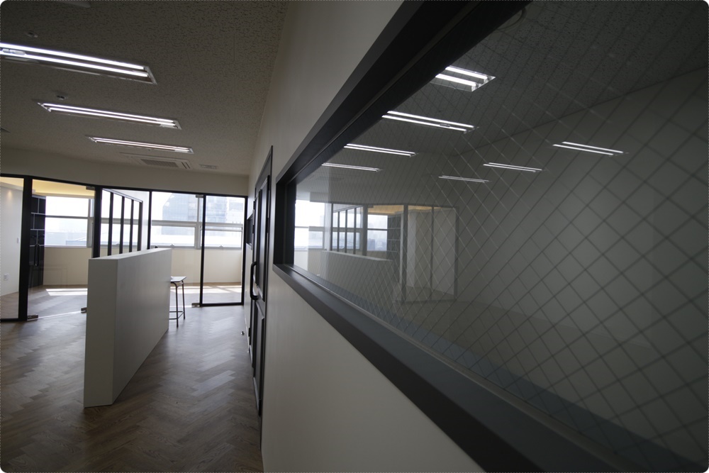 회사의 입구는 컬러와 웨인스코팅을 적용했지만 상부 웨인스코팅을 뚫어 반투명 망입유리를 시공했는데요, 반투명 망입유리는 외부로부터 시선을 차단해 프라이버시를 보호할 수 있고 안에 철사가 구성돼 있어 지진, 해일 등의 자연재해에도 안전하고 화재, 파손 등의 위험한 상황이 발생하더라도 연소를 방지하는 효과가 있으며 파편이 크게 흩어지지 않는 장점이 있어 안전하게 사용할 수 있습니다.