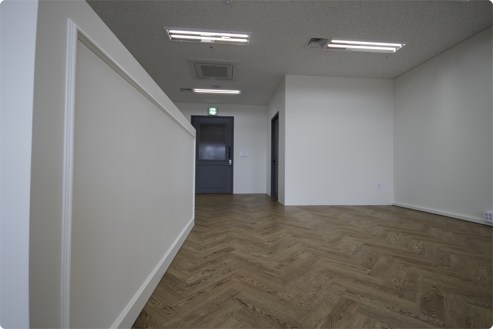 사무실 전체 바닥 마감은 원목을 적용하고 유럽에서 유행하다 최근 국내에서도 인기를 끌고 있는 헤링본 패턴을 적용해 전체적으로 따뜩하고 아늑하며 부드러운 분위기를 연출하되 다양한 색감을 줘 지루하지 않게 스타일링했습니다. 대각선형 배치의 헤링본 패턴은 선형이 아름다운 구조로 독특하면서도 세련된 모습을 자랑하는데요,