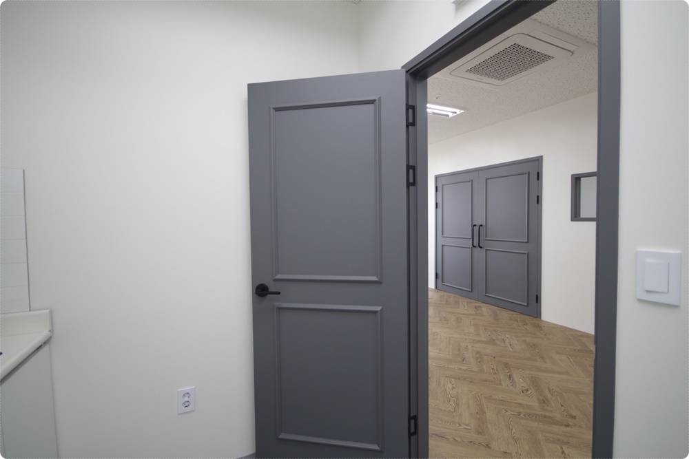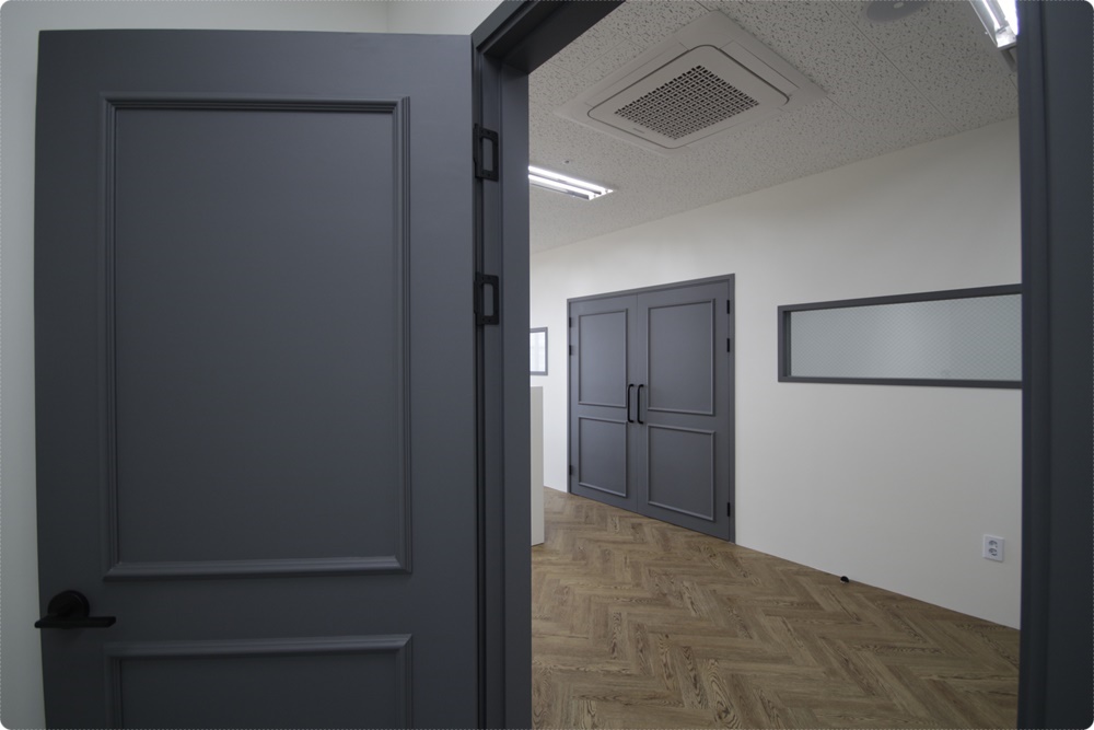 사무실을 들어섰을 때 전체 분위기를 결정하는 것은 바닥과 벽 마감이지만 회사 분위기를 판가름하는 것은 문인테리어라고 해도 과언이 아닐 정도로 문은 실내 분위기는 물론 그 회사의 이미지에도 영향을 주는데요, 첨단을 주도하는 IT 사무실이지만 세종, 청주 대전이라는 행정 도시의 분위기를 반영해 차분한 컬러에 고급스러운 웨인스코팅을 디자인했습니다.