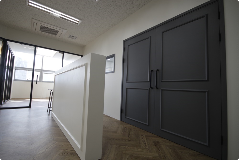 웨인스코팅 문짝은 대표실뿐만 아니라 전체적으로 컬러와 디자인을 통일해 적용했습니다. 문 인테리어를 통일하는 것은 수직 관계가 아닌 수평 관계를 부여하기도 하는데요, 언제든지 서슴없이 열고 들어가 직원과 임원 혹은 선배와 후배가 소통할 수 있는 회사가 되기를 바라는 마음에 저희 916디자인에서 제안했고 클라이언트가 흔쾌히 받아들여 최종적으로 시공하게 됐습니다.