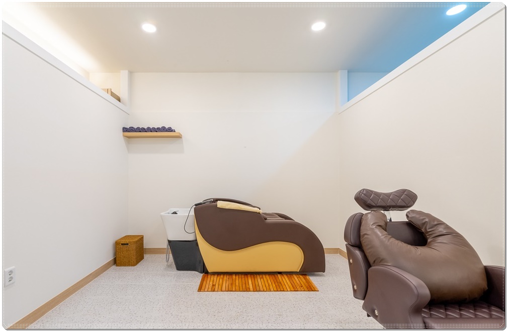 아치형 입구가 특색있는 샴푸실입니다. 아치형 문의 문틀에 우드톤을 적용해 시공했고 안쪽에는 우드 수납장과 브라운 계열의 가죽 의자를 배치해 디자인과 인테리어적으로 연결되면서 통일감이 느낄 수 있도록 연출했으며 천장에는 간접등을 설치해 샴푸를 위해 누웠을 때 눈부심이 없도록 배려했습니다.