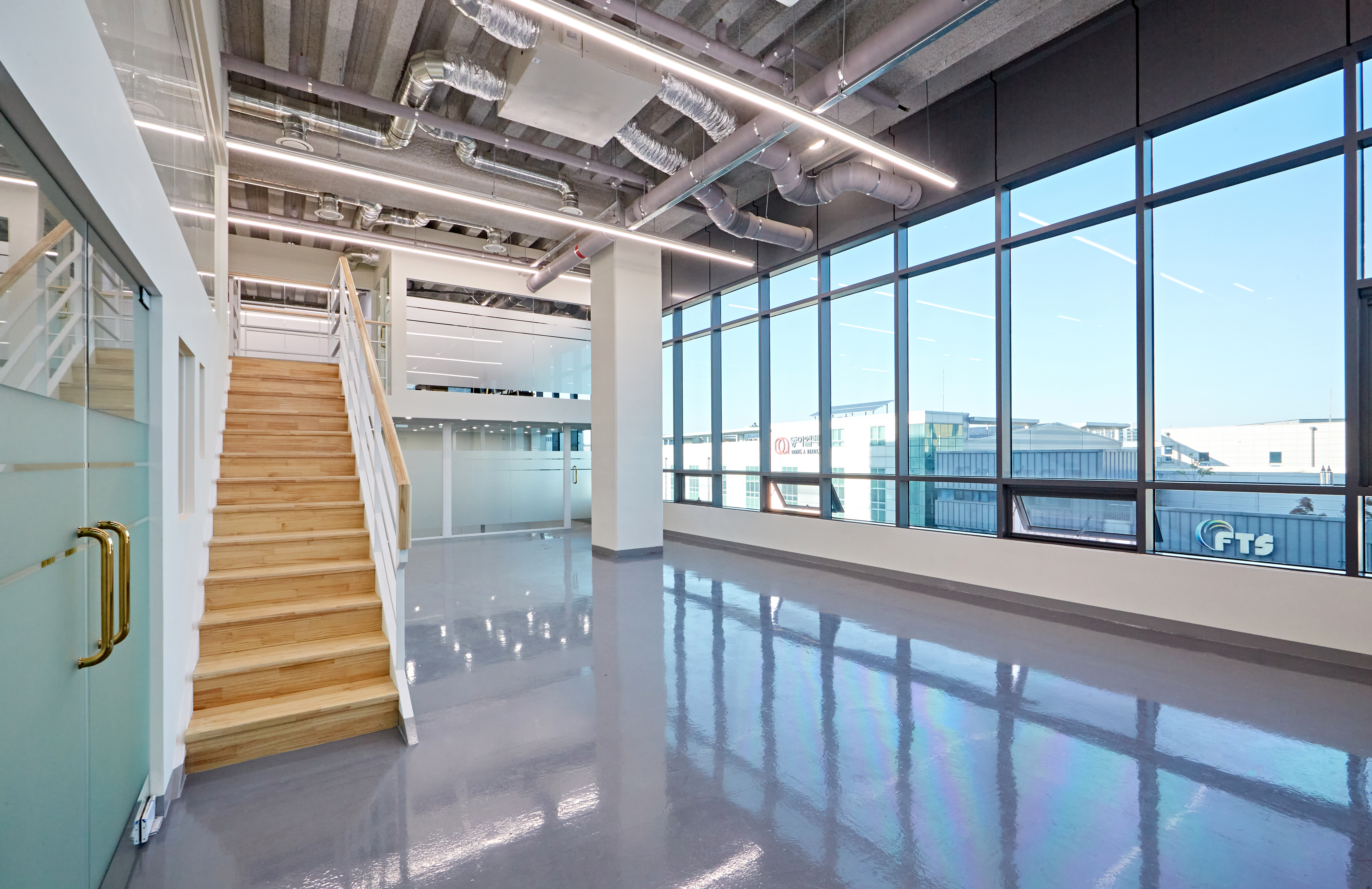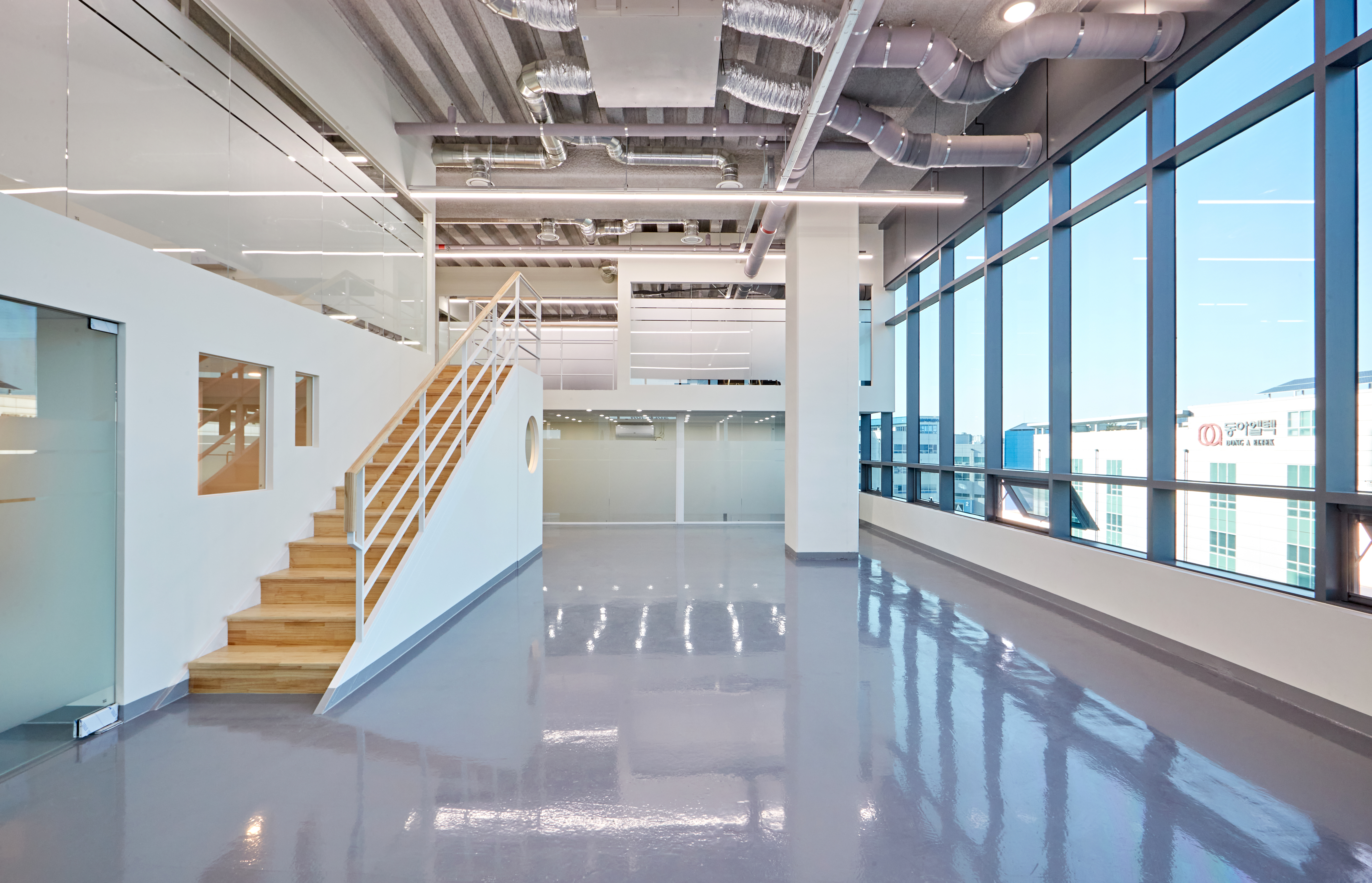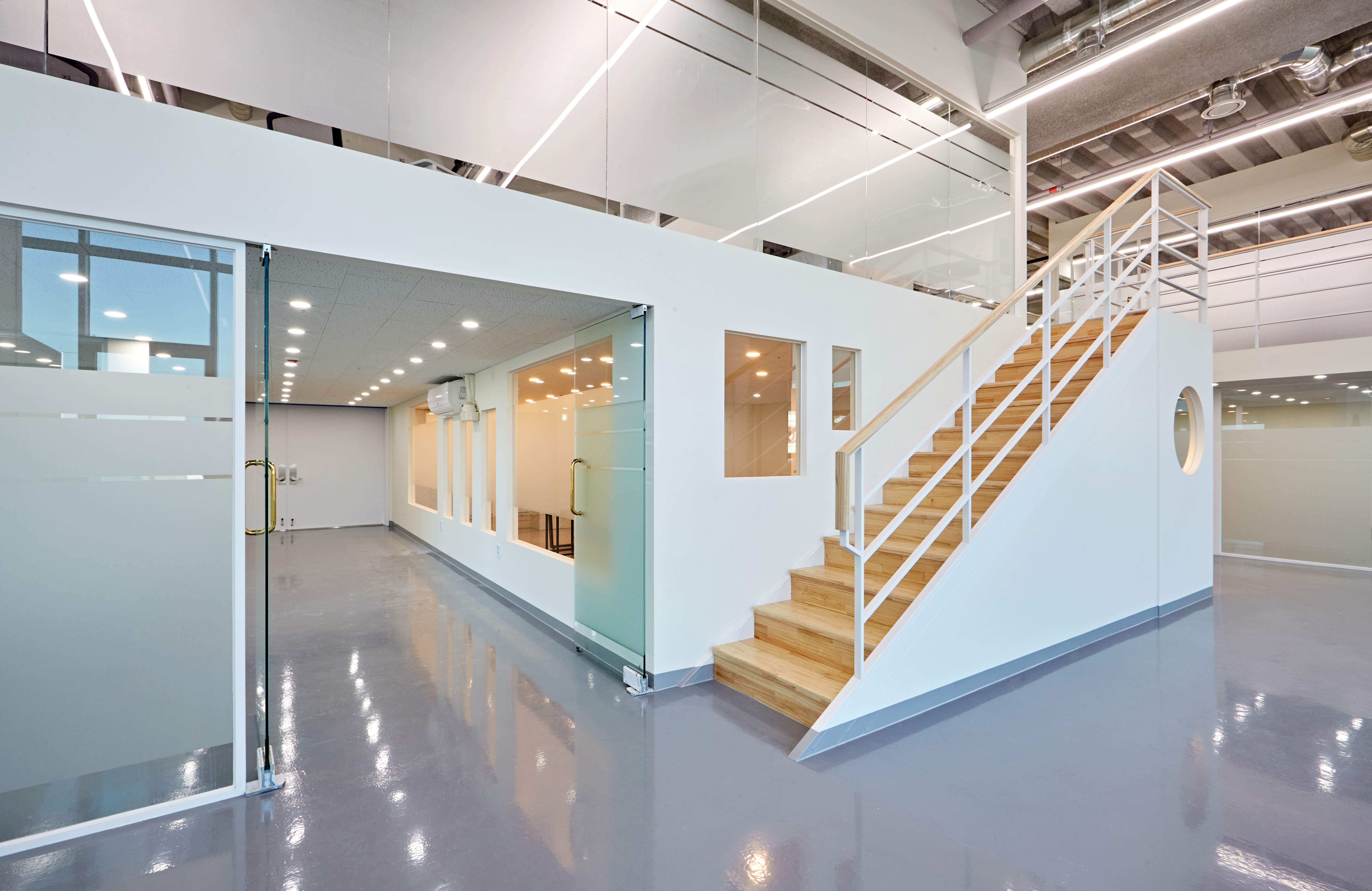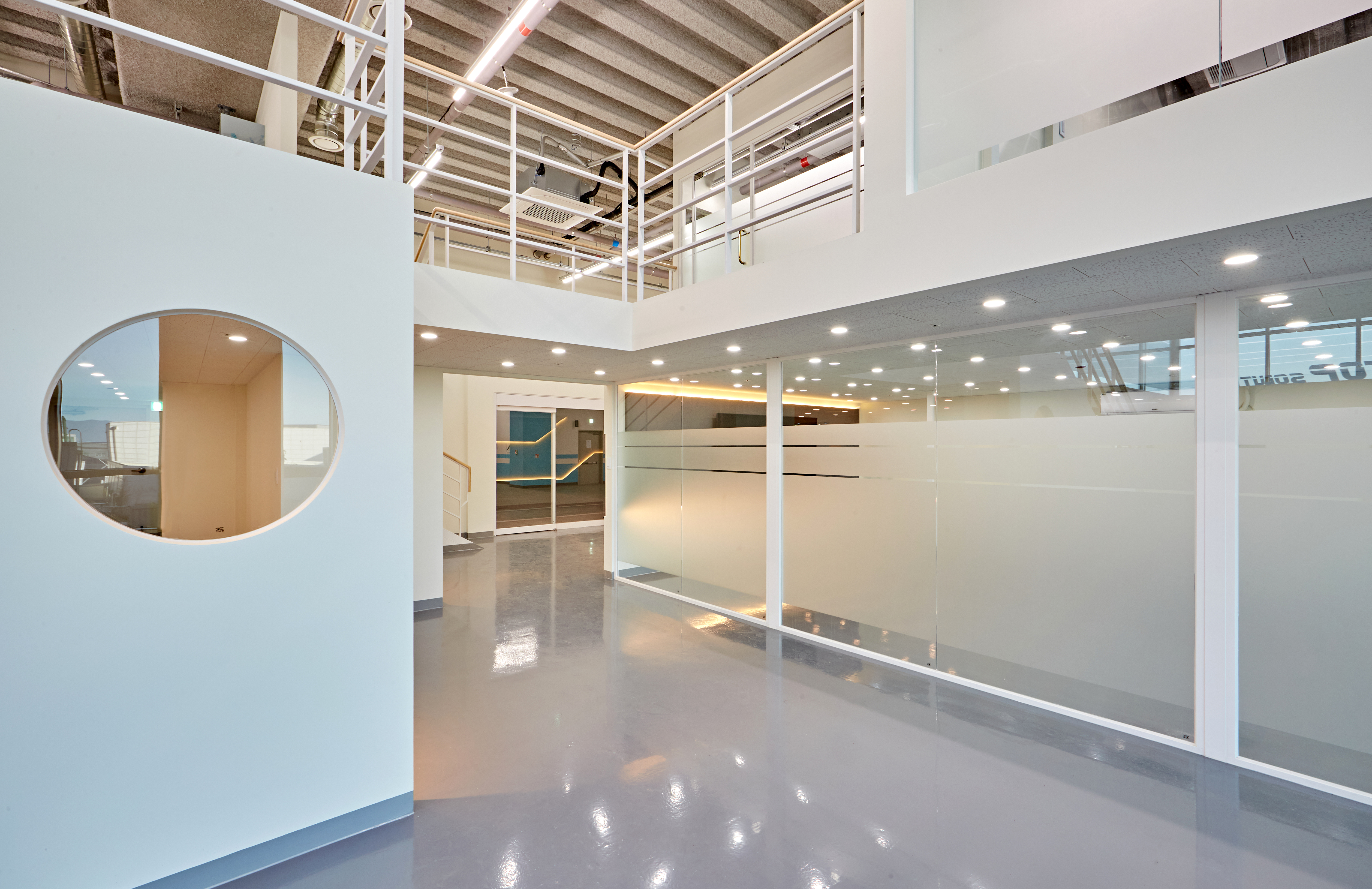 그 옆으로는 광활한 복도가 보여지며 그레이 유광 재질로 바닥을 시공하여 세련된 분위기를 마주할 수 있습니다. 또한 전체 천장이 존재하지 않고 2층까지 노출 천장 시공이 이뤄져있어 주조명 없이 라인 조명과 보조등이 설치되었는데요.