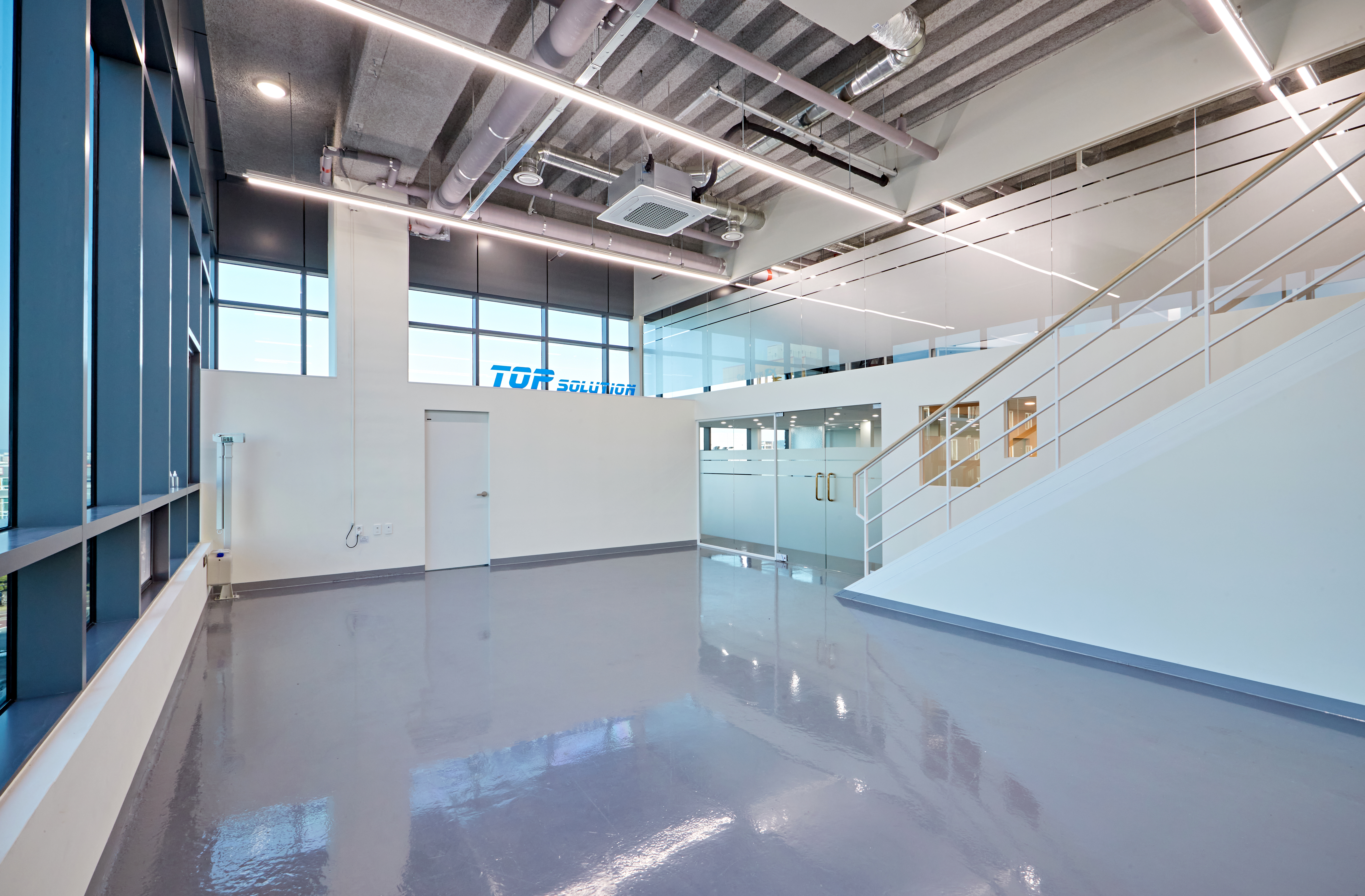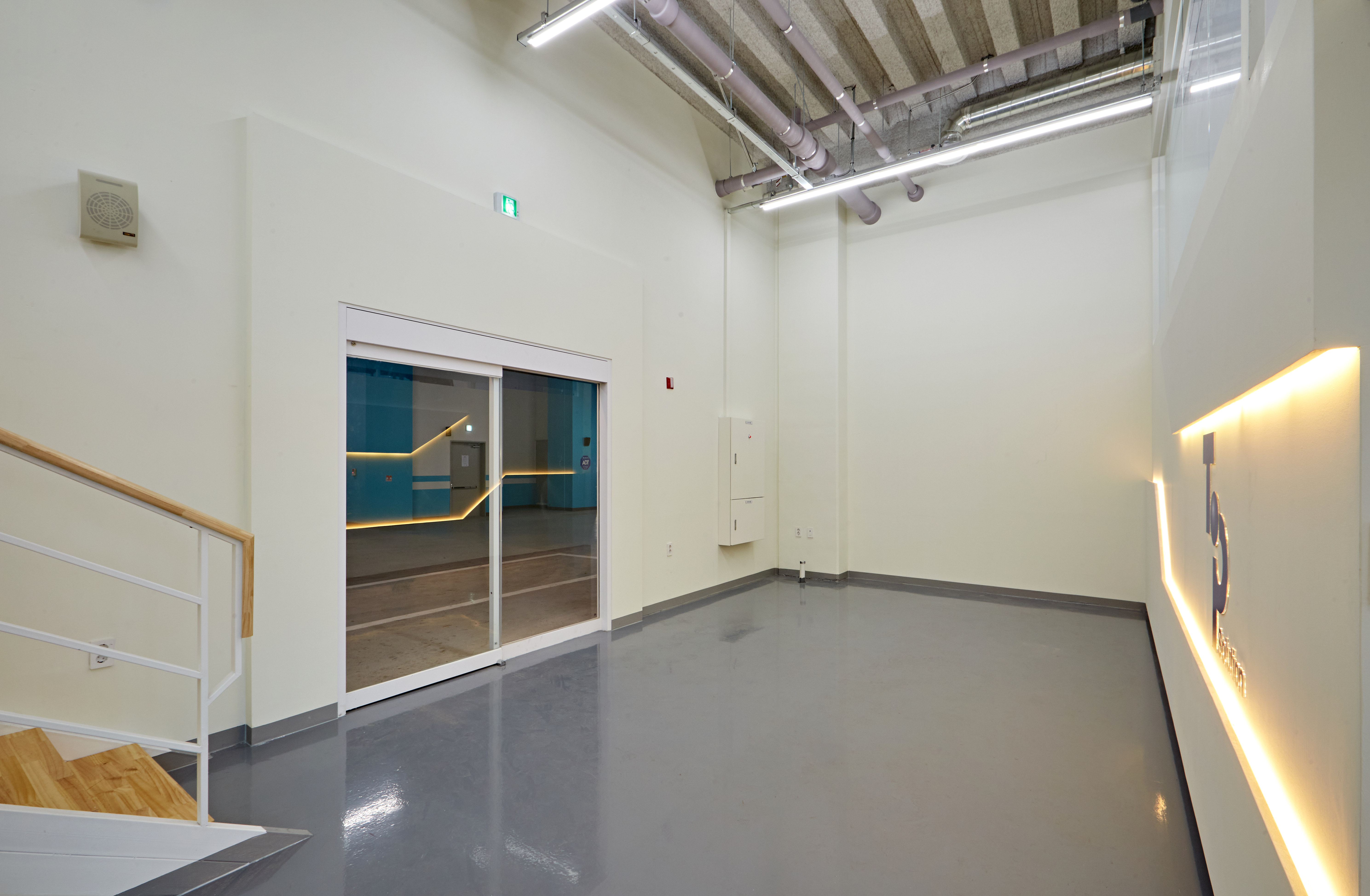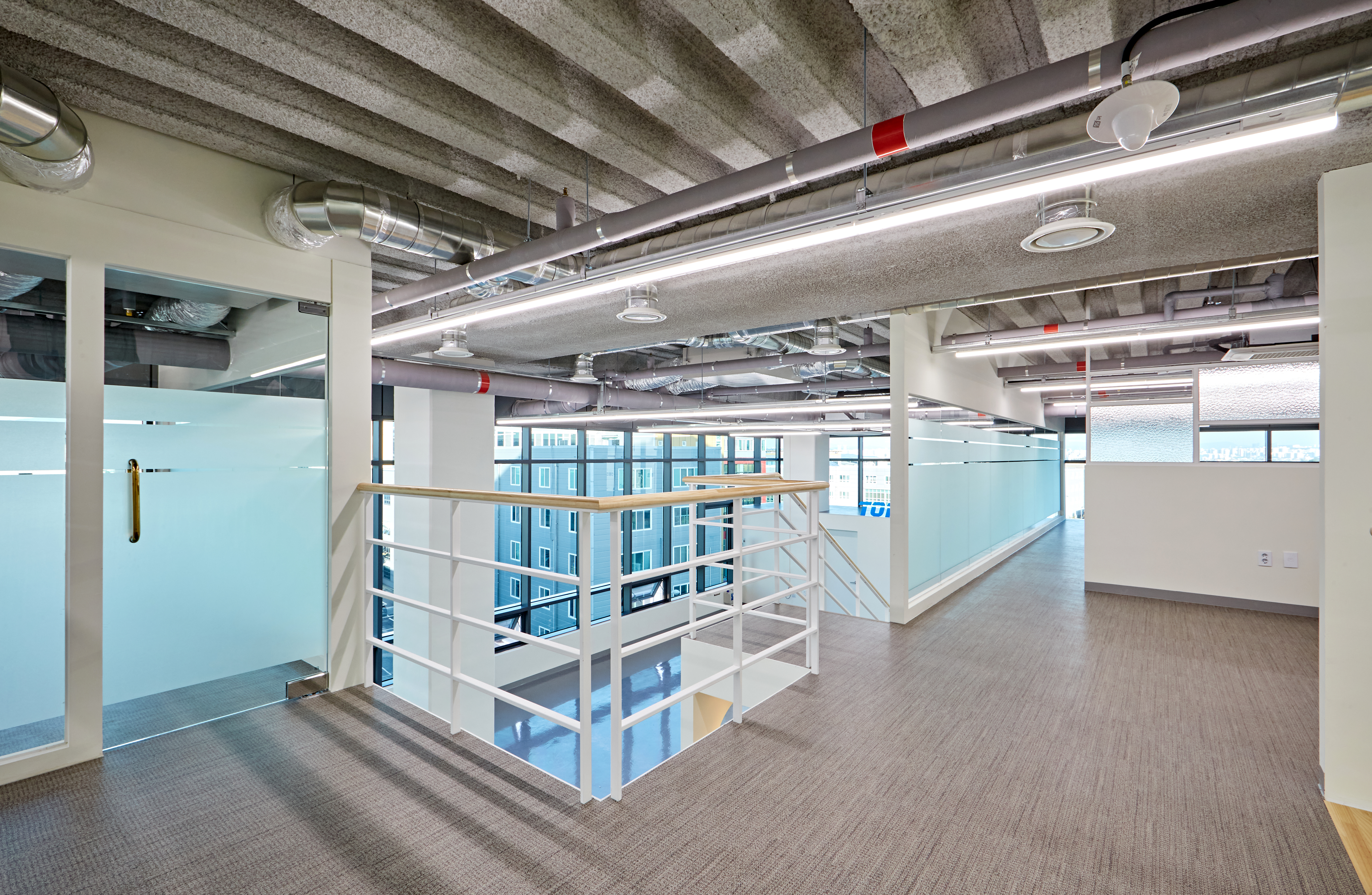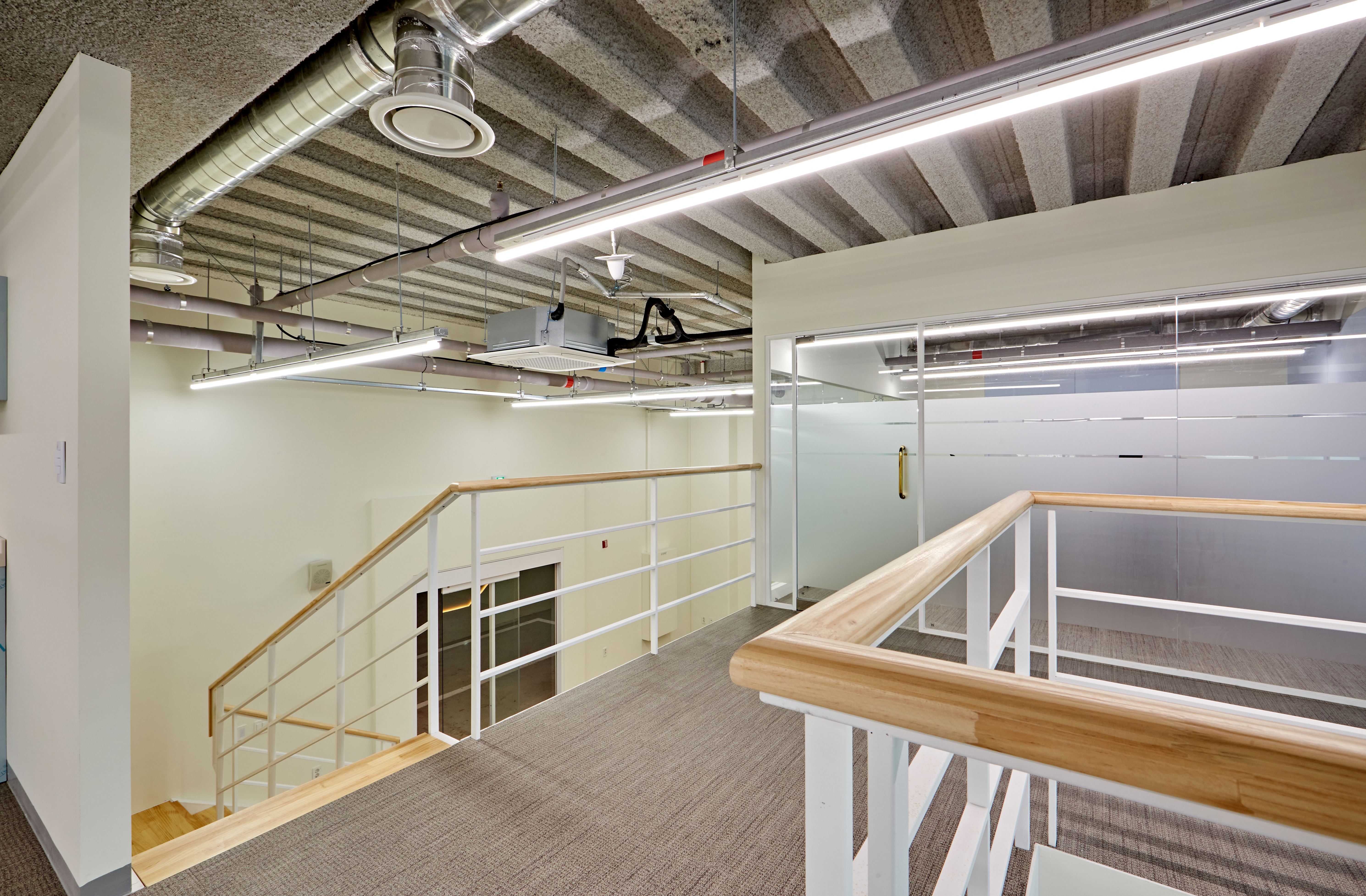 그 옆으로는 광활한 복도가 보여지며 그레이 유광 재질로 바닥을 시공하여 세련된 분위기를 마주할 수 있습니다. 또한 전체 천장이 존재하지 않고 2층까지 노출 천장 시공이 이뤄져있어 주조명 없이 라인 조명과 보조등이 설치되었는데요.