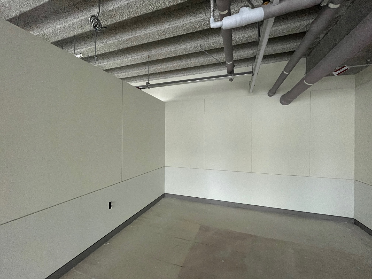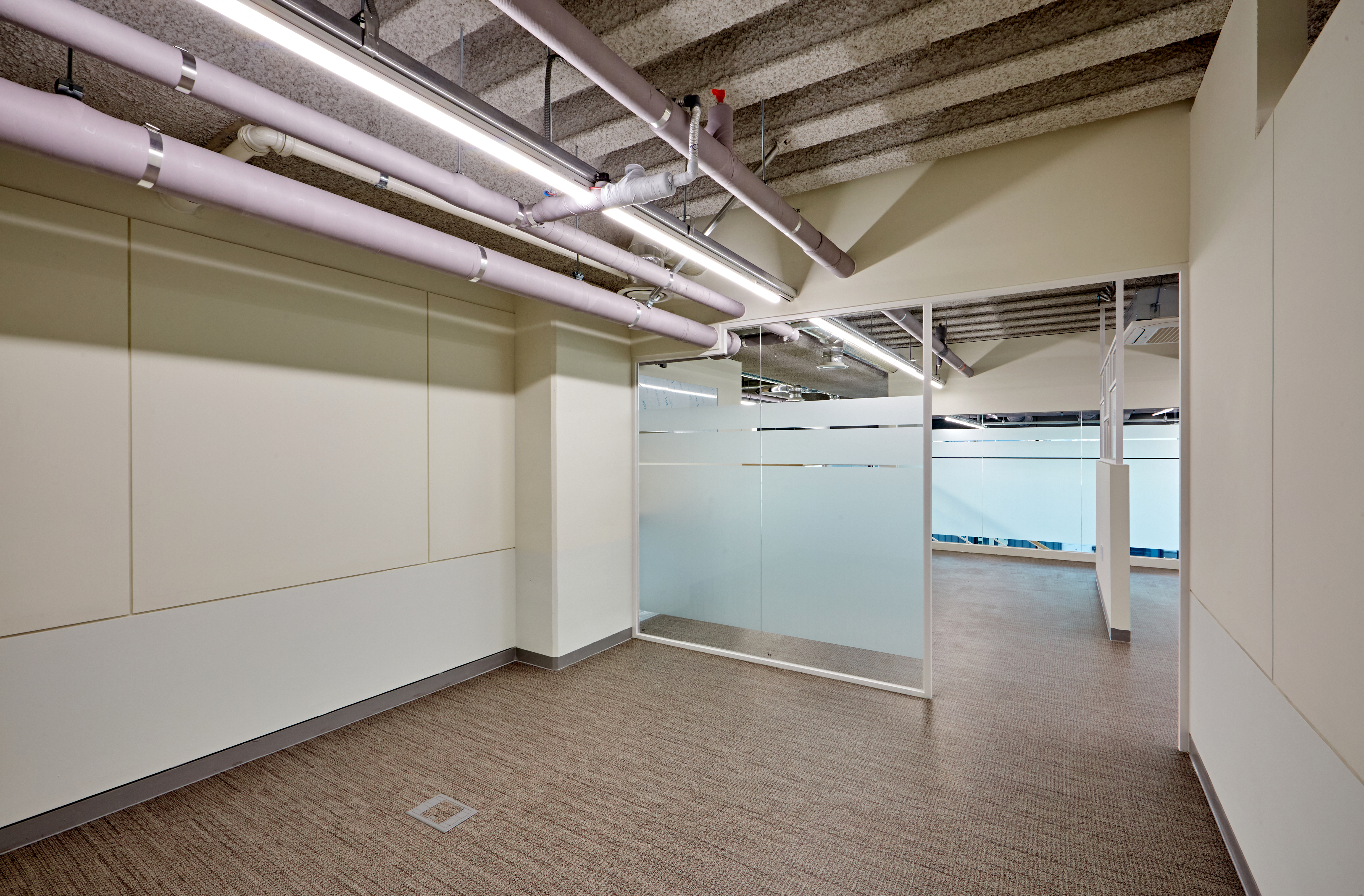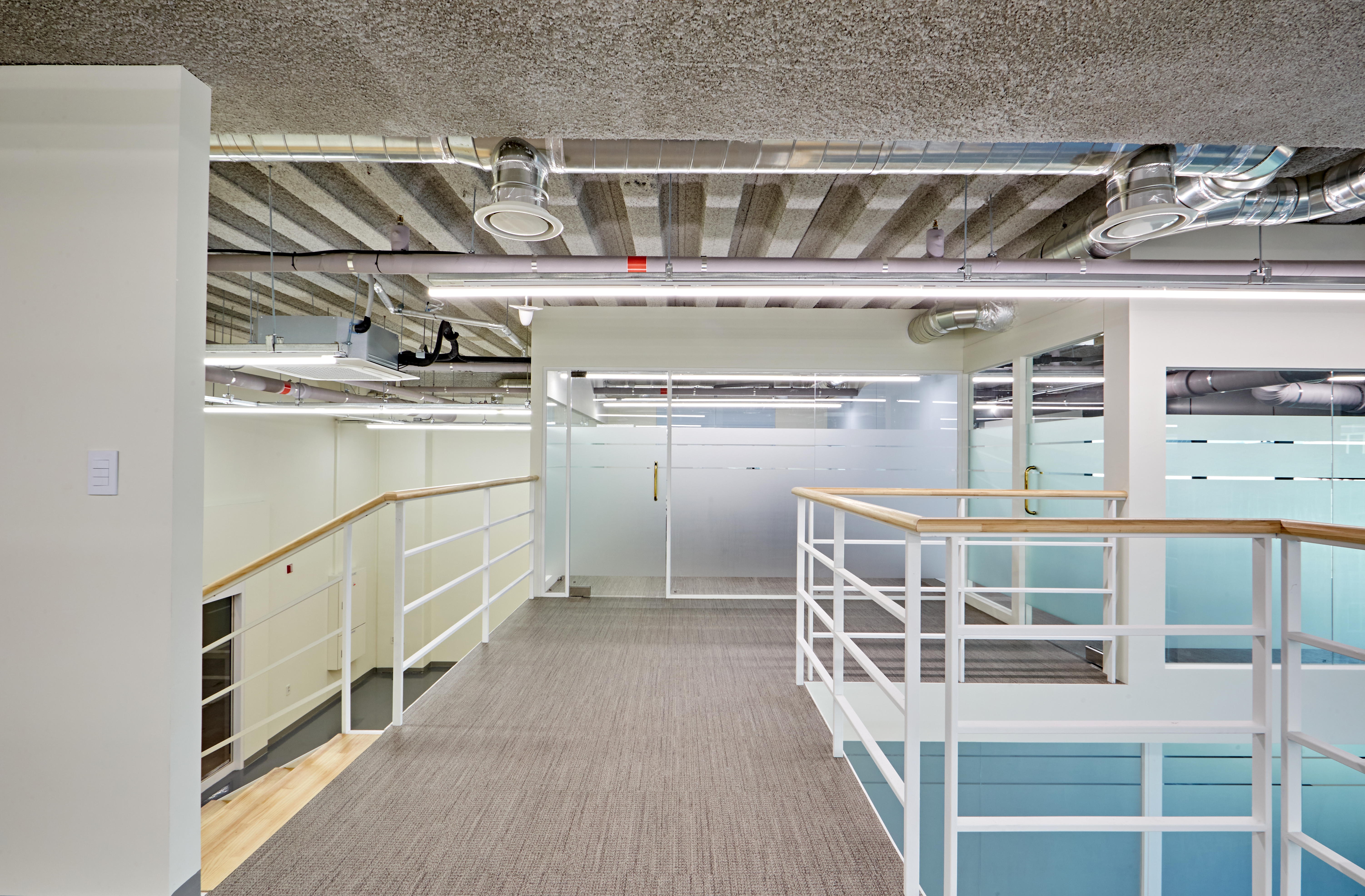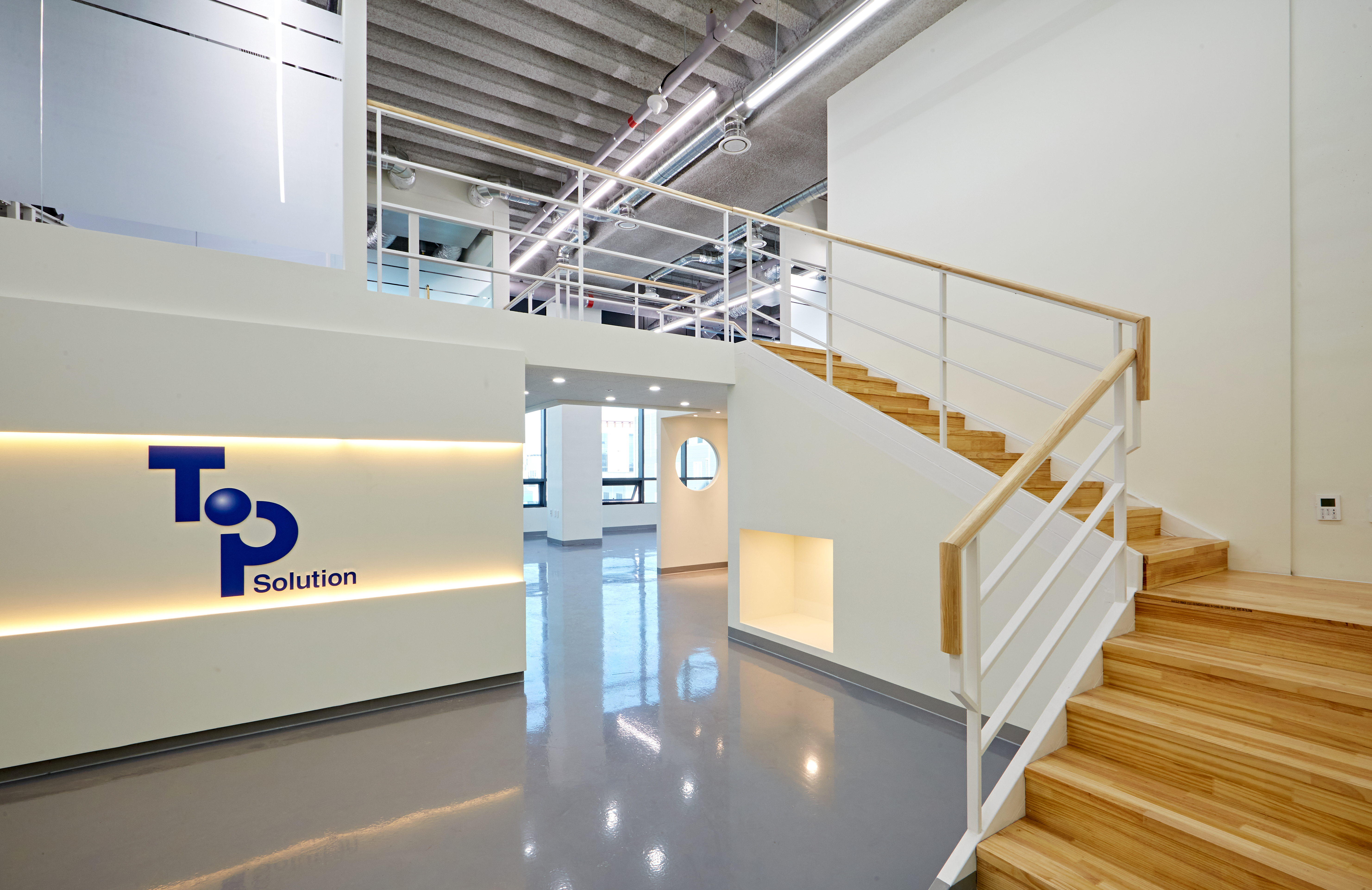 그 옆으로는 광활한 복도가 보여지며 그레이 유광 재질로 바닥을 시공하여 세련된 분위기를 마주할 수 있습니다. 또한 전체 천장이 존재하지 않고 2층까지 노출 천장 시공이 이뤄져있어 주조명 없이 라인 조명과 보조등이 설치되었는데요.