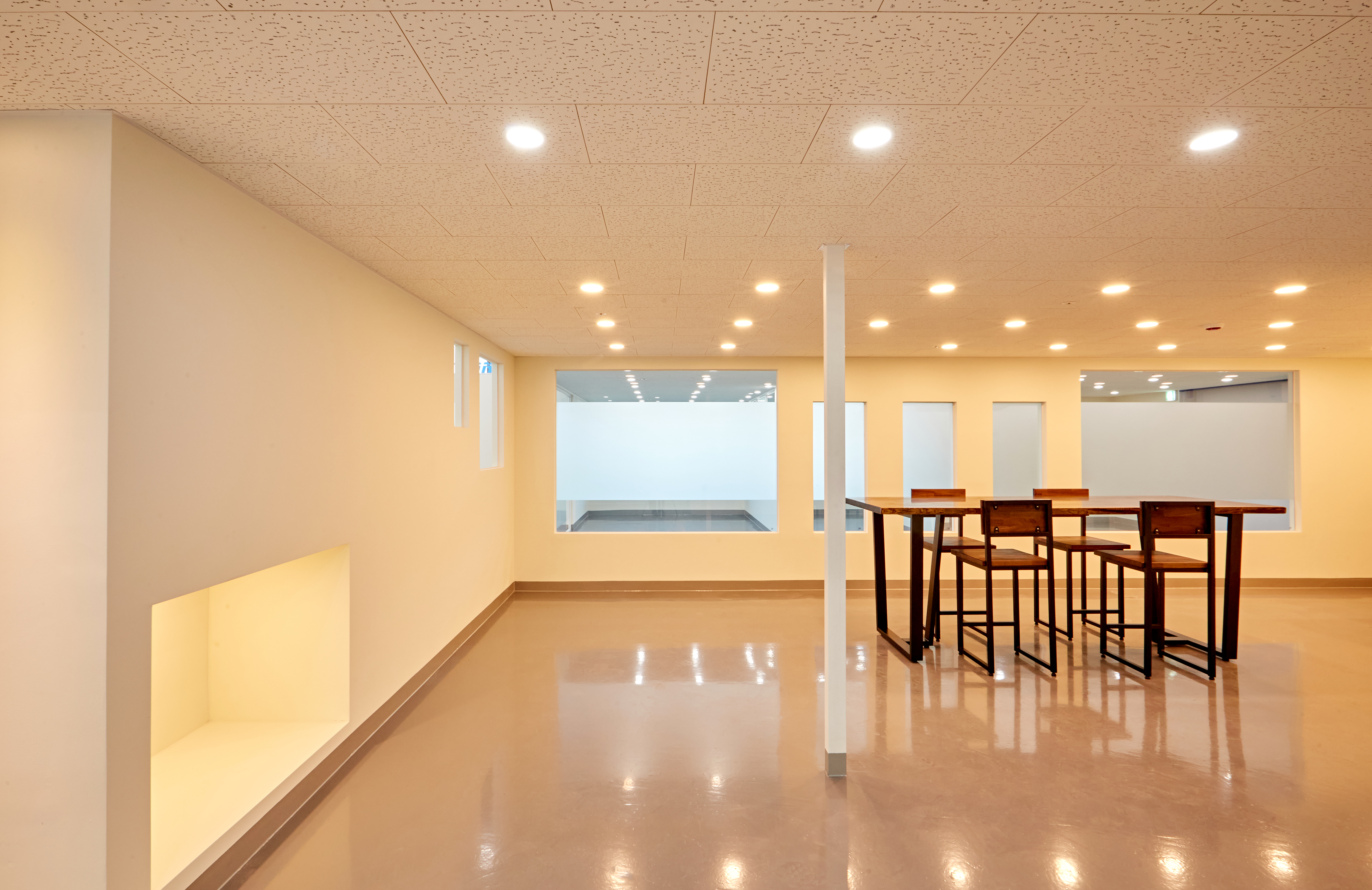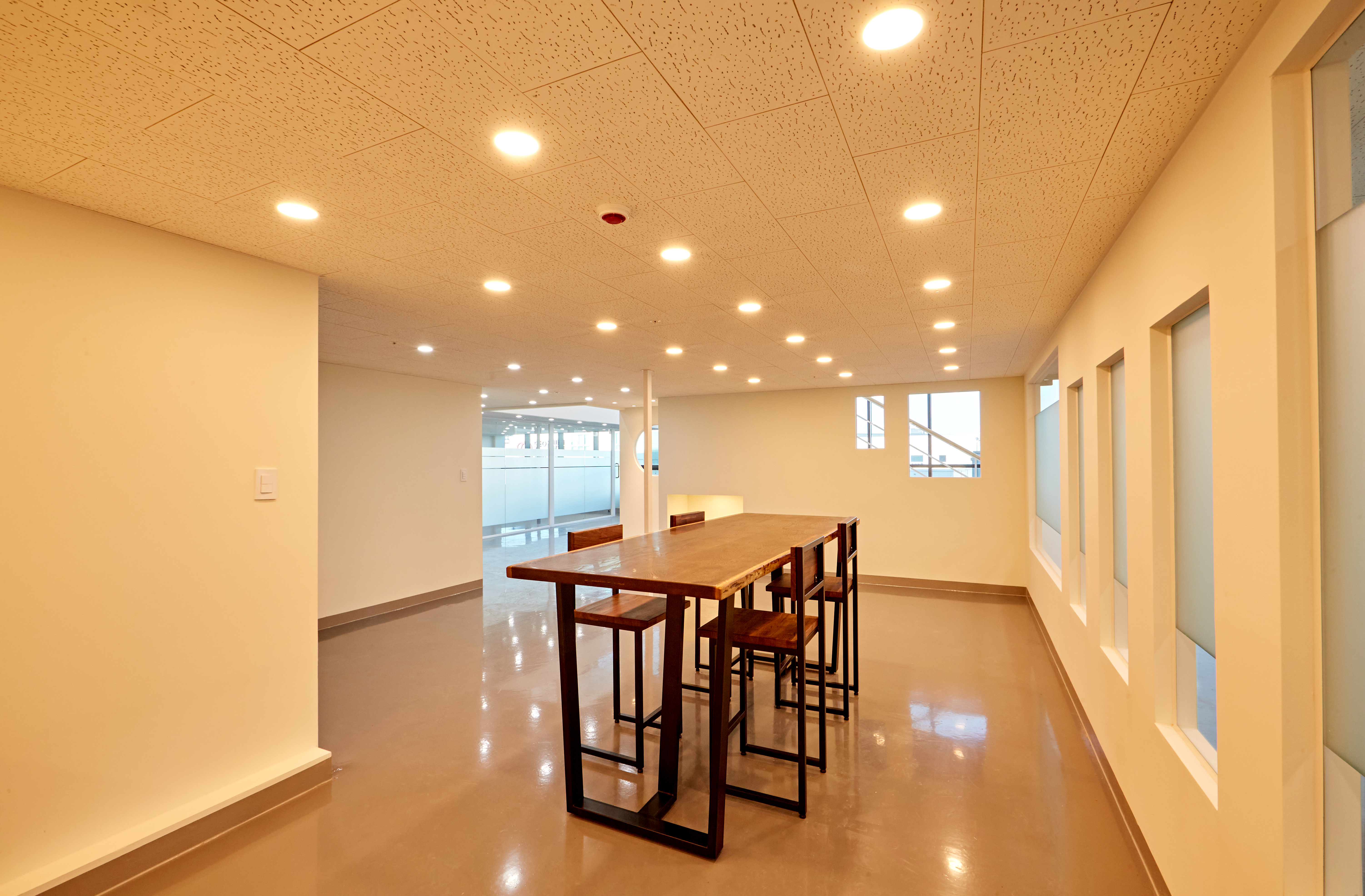1층 공간부터 살펴보시자면 휴게공간인 카페테리아입니다. 길다란 테이블과 함께 높은 바의자로 이뤄져있어 더욱 확장되어 보이는 효과가 있습니다. 그리고 가벽을 중심으로 양쪽 조명의 컬러가 다른데요. 휴식 공간에는 조금 더 아늑한 주광빛을, 사무공간으로 이어지는 복도는 주백색으로 깔끔한 연출을 하였습니다.