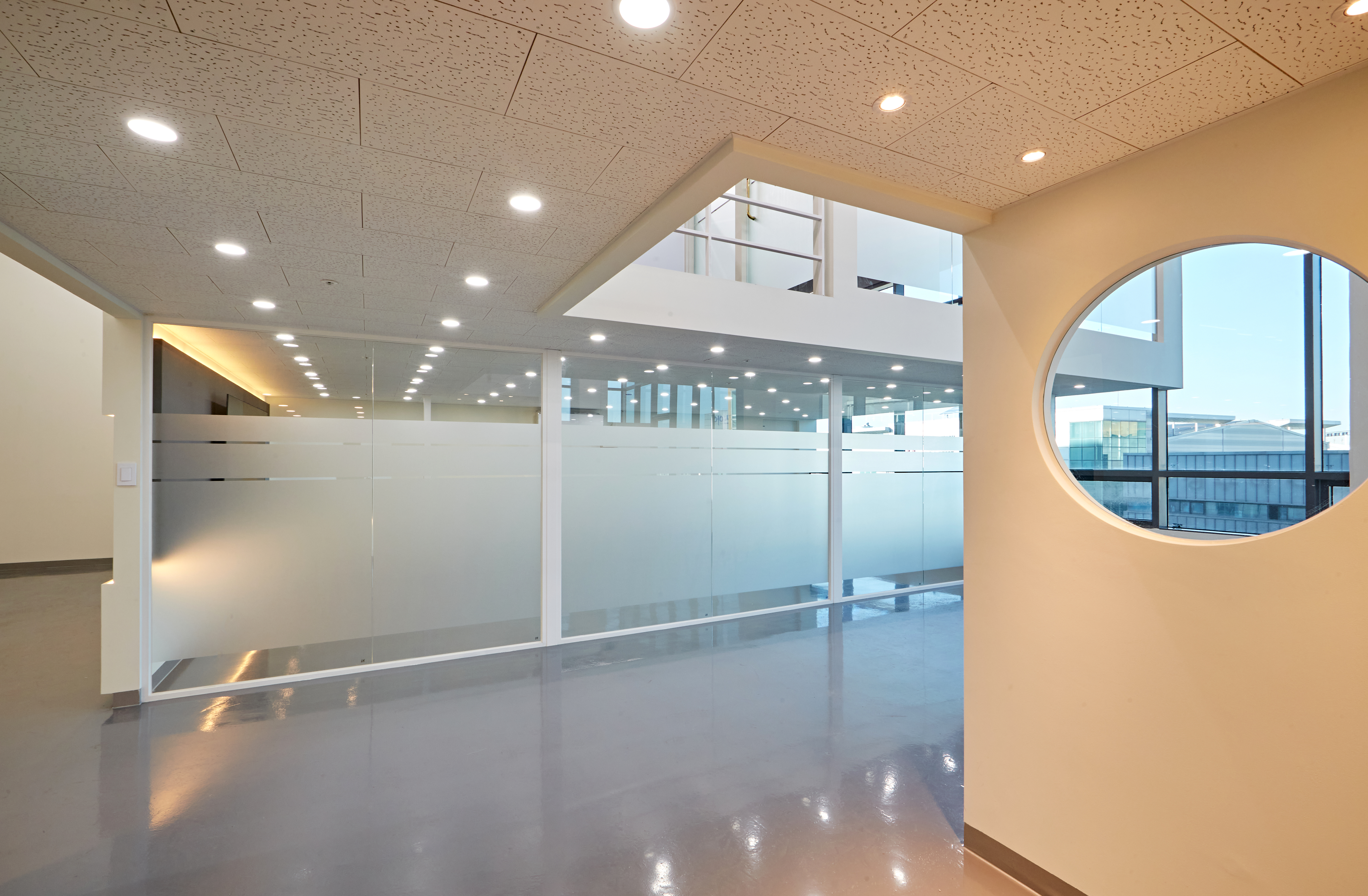 2층으로 올라가면 사무실 및 대표실과 회의실이 있습니다. 전체 화이트 가벽 프레임으로 분리 되어 있으며 투명 유리와 불투명유리가 불규칙적으로 배치되어 재미를 더하고 있습니다. 그리고 모든 개방감을 위해서 개별 룸도 통창으로 시공되어 시야를 확보하였습니다.