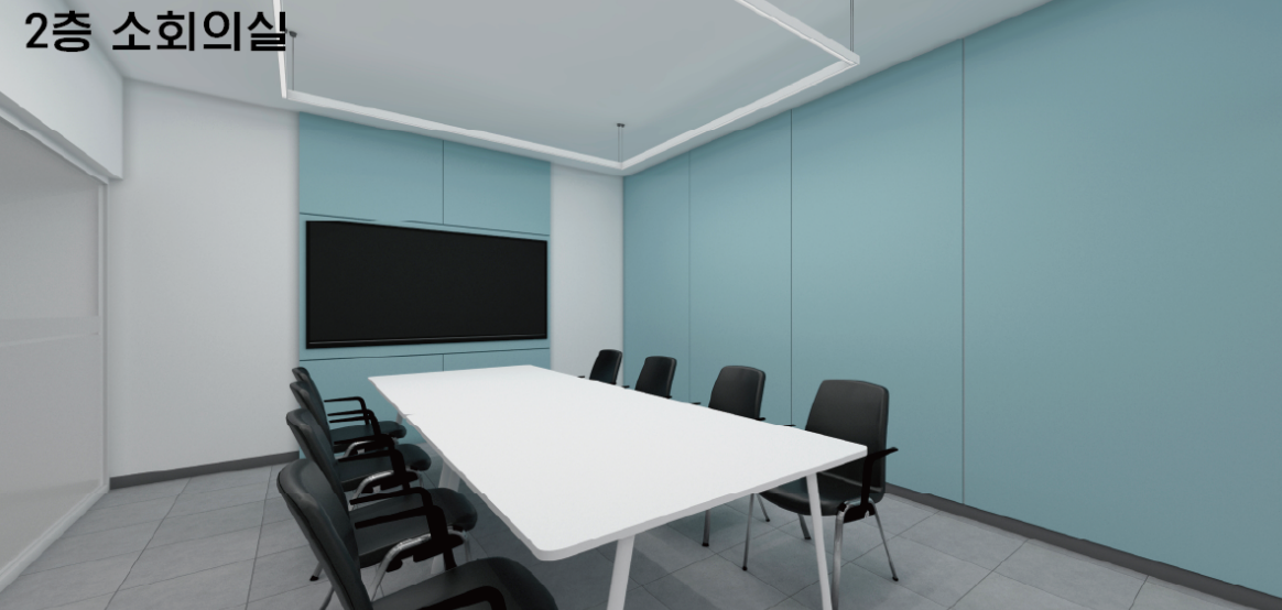 소회의실은 3명이서 각자의 테이블에 효과적인 소통을 이룰 수 있도록 배치하였습니다. 그리고 벽에는 화이트 보드와 하늘색 포인트로 마감하였으며 외부와는 다르게 매트한 질감의 바닥재로 변화를 주었습니다.