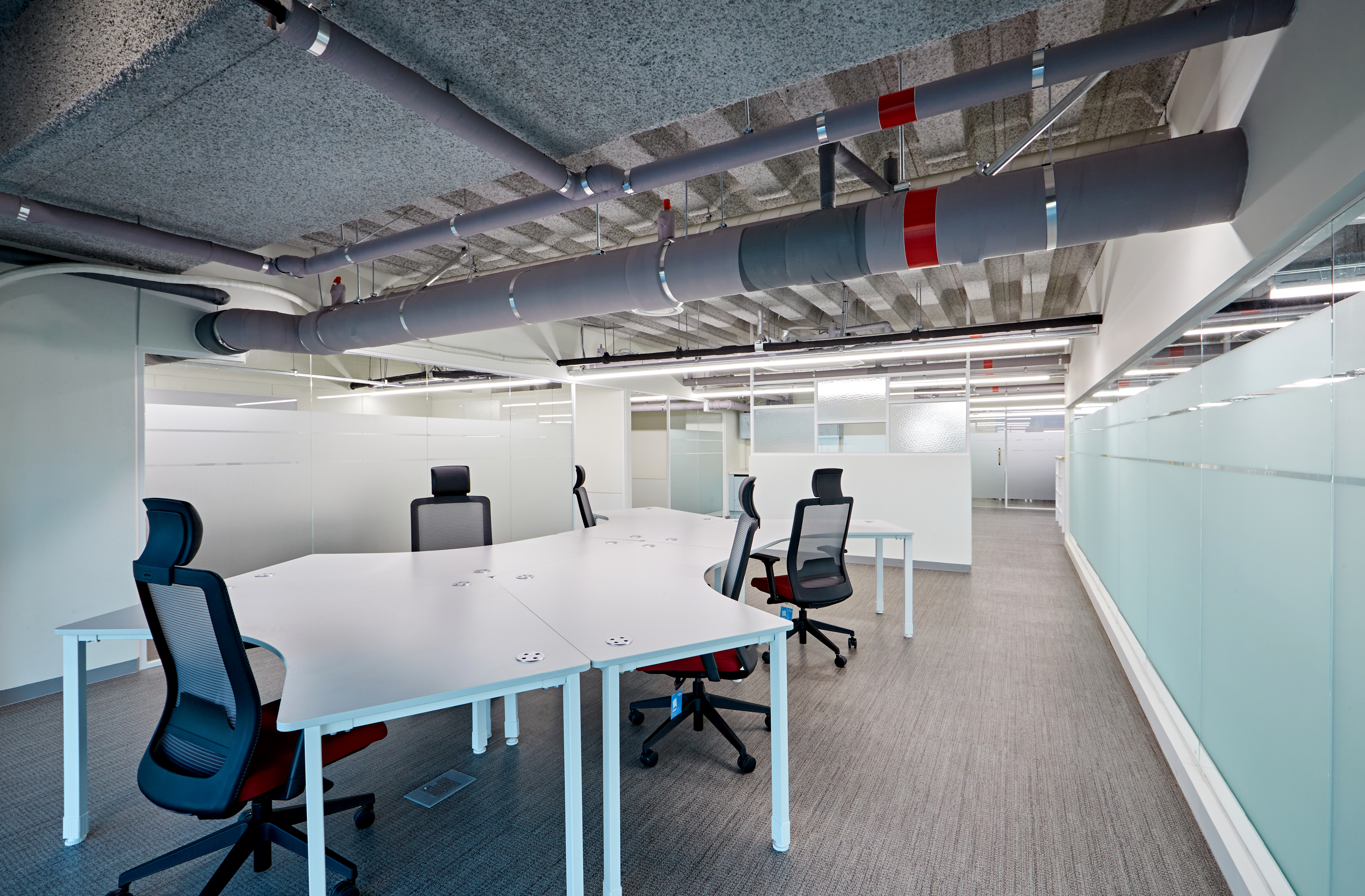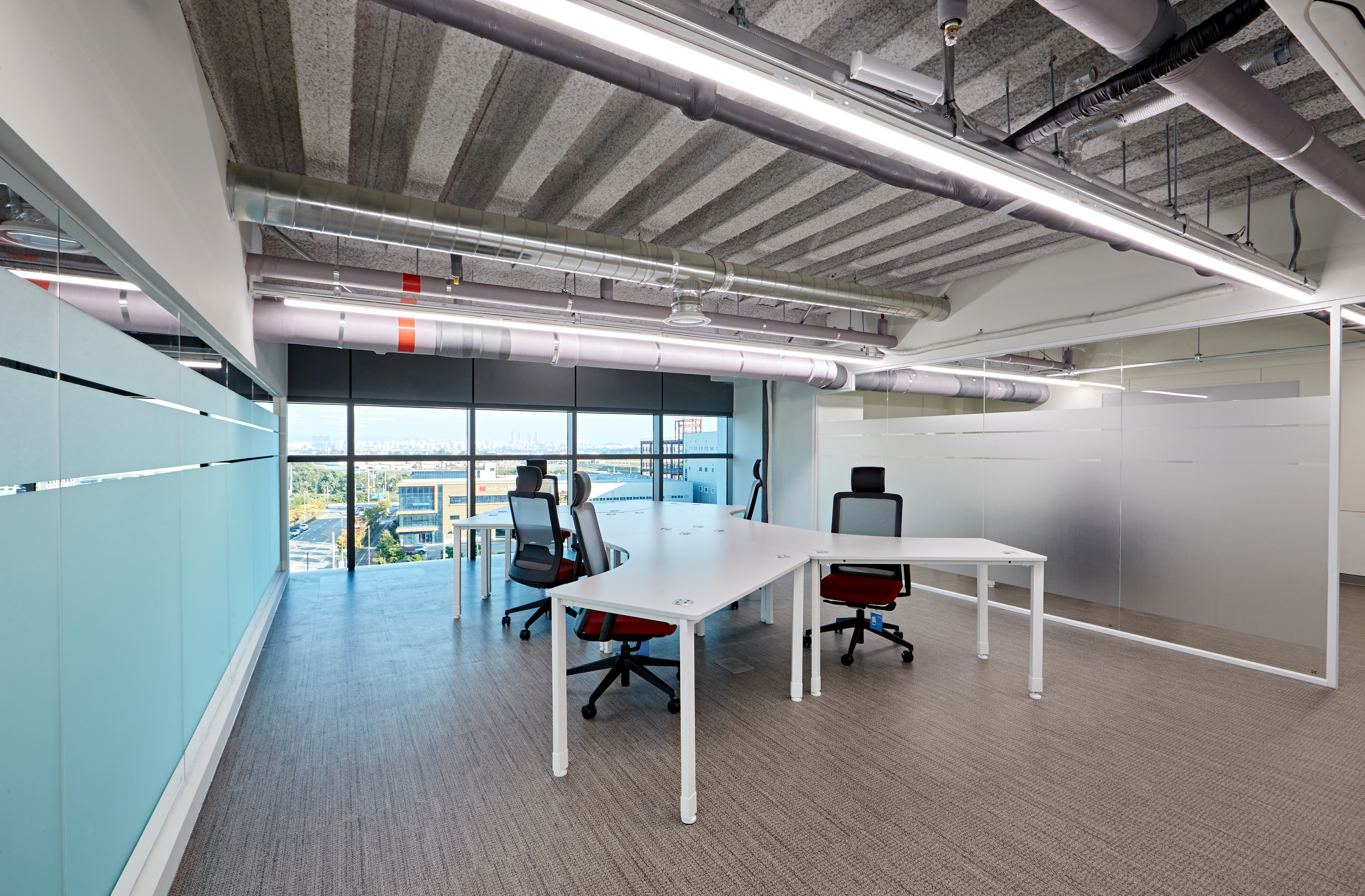 대회의실은 메인 테이블과 함께 특이한 디자인의 테이블을 함께 배치하였습니다. 직선과 곡선의 조화가 돋보이는 것을 알 수 있으며 천장의 노출 배관 부분도 그레이로 마감하여 통일성을 높였는데요. 어김없이 통창으로 배치된 한 쪽면과 깔끔한 컬러로 도장된 면이 대비를 이루며 세련된 연출을 도와줍니다.