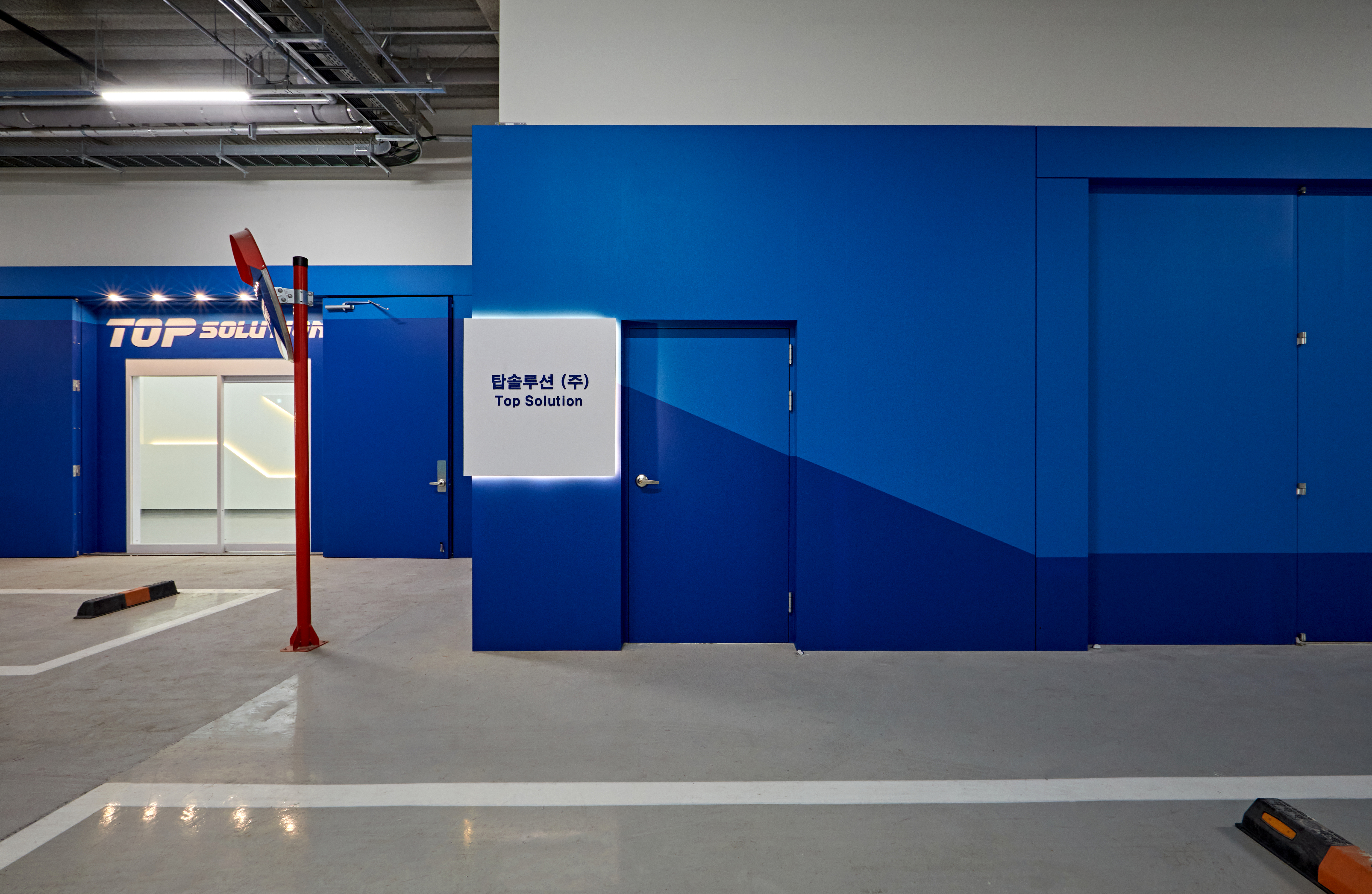 시원한 블루컬러가 인상적인 외관 파사드부터 살펴보겠습니다. 지식산업센터의 특성상 드라이브인 시스템이 되어 있는데요. 멀리서도 눈에 띌 수 있는 컬러는 물론 차량이 들어오는 공간까지 도장을 섬세하게 진행하였습니다. 돌출된 사각형 간판에는 후면 LED 조명을 매립하였으며 역동적인 로고 글씨체로 강렬한 인상을 주었습니다.