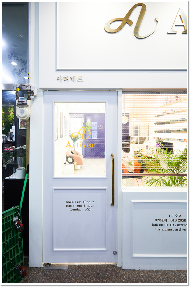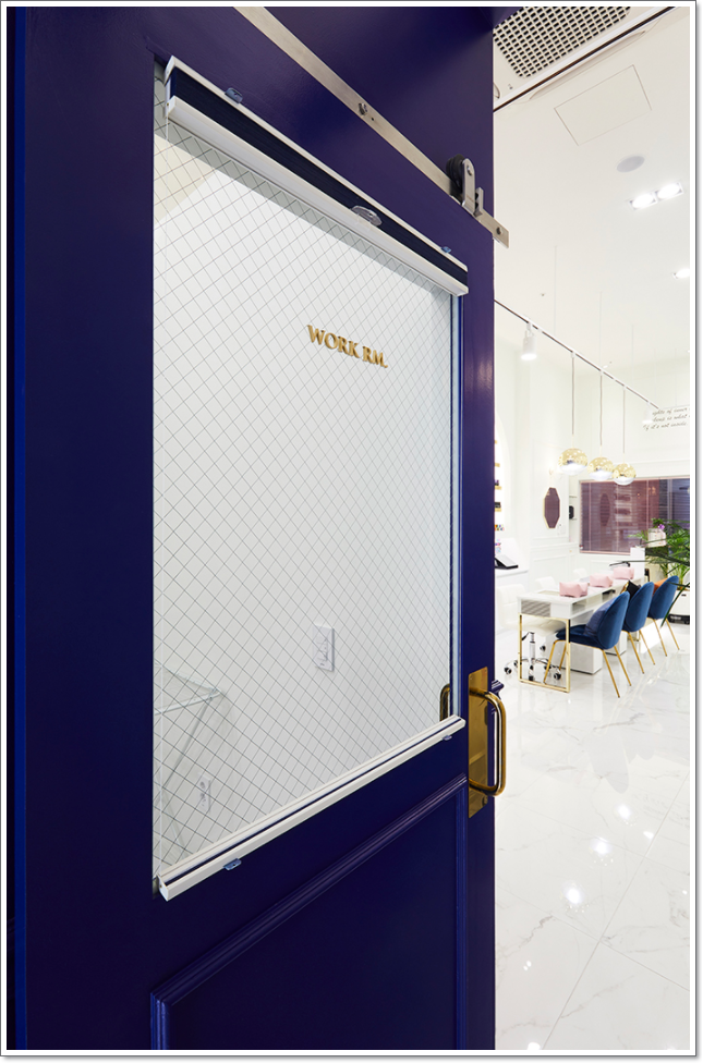 네일샵의 반대편 출입문으로 돌아가보면 당장의 출입문만 보시더라도 앞에 설명해드렸던 출입문과 비슷하지만 무언가 더 화이트톤의 색감을 살린 외벽을 더 사용하여 가게의 느낌을 살리는데 일조를 하고 있습니다. 이 출입문에도 우아함을 한층 돋보이게 할 수 있는 몰딩 요소들이 많이 들어가있으며 이러한 분위기를 더욱 살리기 위해서 글귀와 문구를 넣어서 지나다니는 고객들이 시선이 자연스럽게 가게로 오도록 돌릴 수 있게끔 만들어보았습니다.