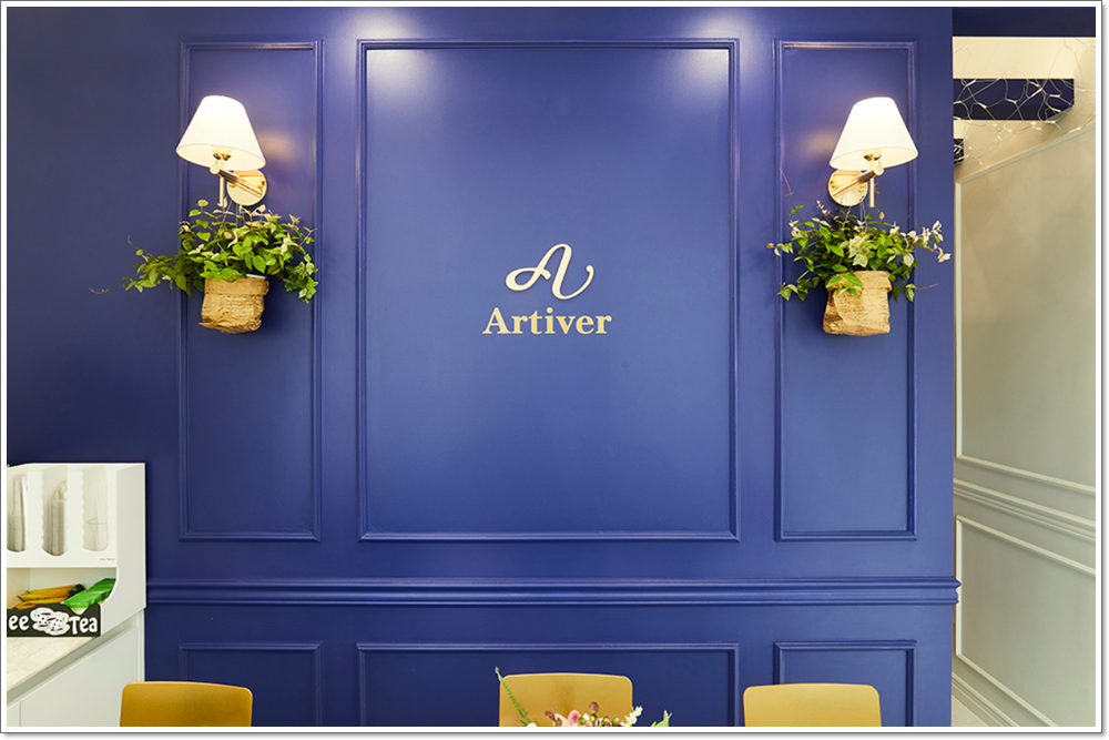 가게 내부 또한 간판에 있는 글귀를 이용한 우아하고 아름다운 분위기를 이어나가보았으며 지금 사진에서 보이는 외벽이 가게의 구석구석에서 중요한 포인트를 담당하고 있는 블루톤 색감의 외벽이라고 할 수 있습니다. 외벽 또한 그저 평범한 외벽이 아니라 웨인스코팅이라는 몰딩 기법을 이용해서 벽의 우아함을 살림과 동시에 벽이 넓어보이기도 하고 유럽풍으로 느껴지게도 만들고 있습니다. 뿐만 아니라 조명도 분위기 조성을 하는데 고조시키고 있습니다.