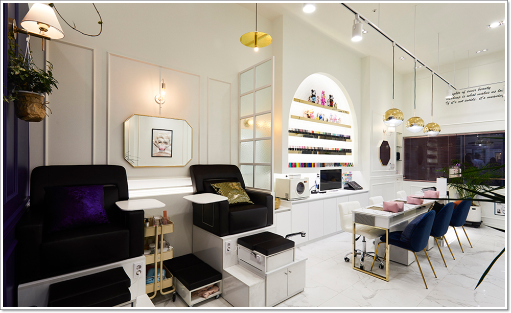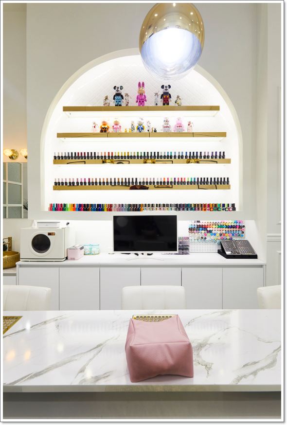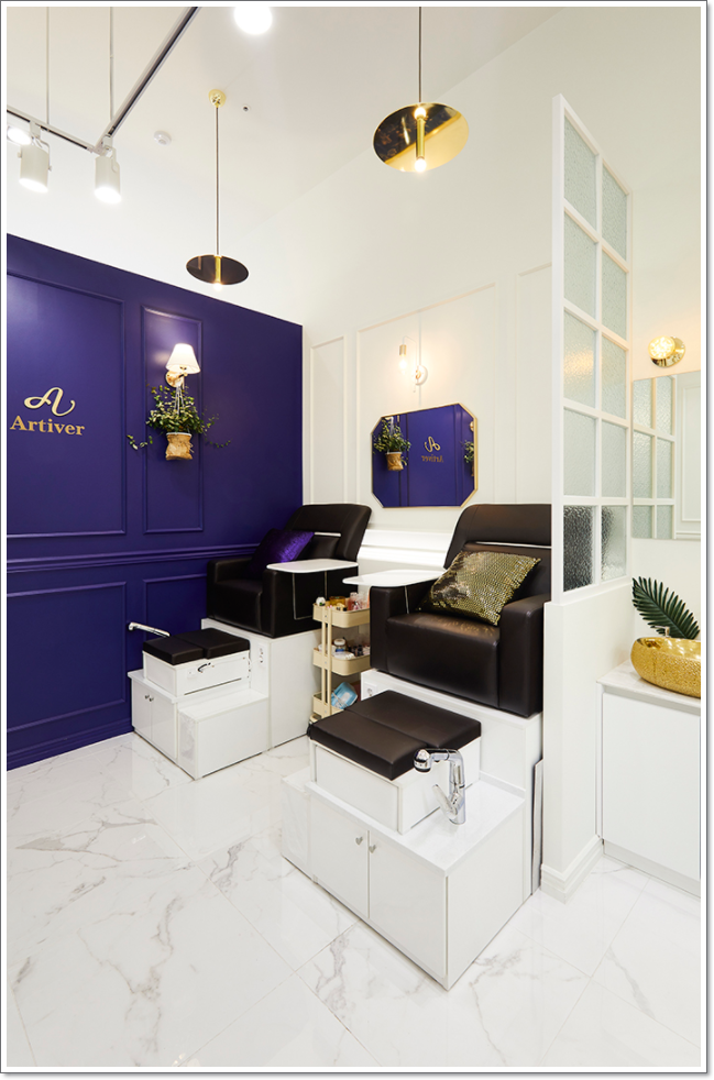 이처럼 916 디자인은 자칫하면 좁아보일 수 있는 네일샵의 공간 구성을 색채의 조화와 포인트 요소를 이용해서 돋보이게 구성해보았습니다. 작업 공간 같은 경우에도 고객이 이를 이용함에 있어서 부담스럽지 않고 시선을 여러 곳으로 향하게 할 수 있도록 불릴만한 구성을 많이 추가하였으며 시선을 정면으로 고정시키지 않고 자유 분방하게 돌림으로 조금 더 편안하게 느껴지실 것입니다.
