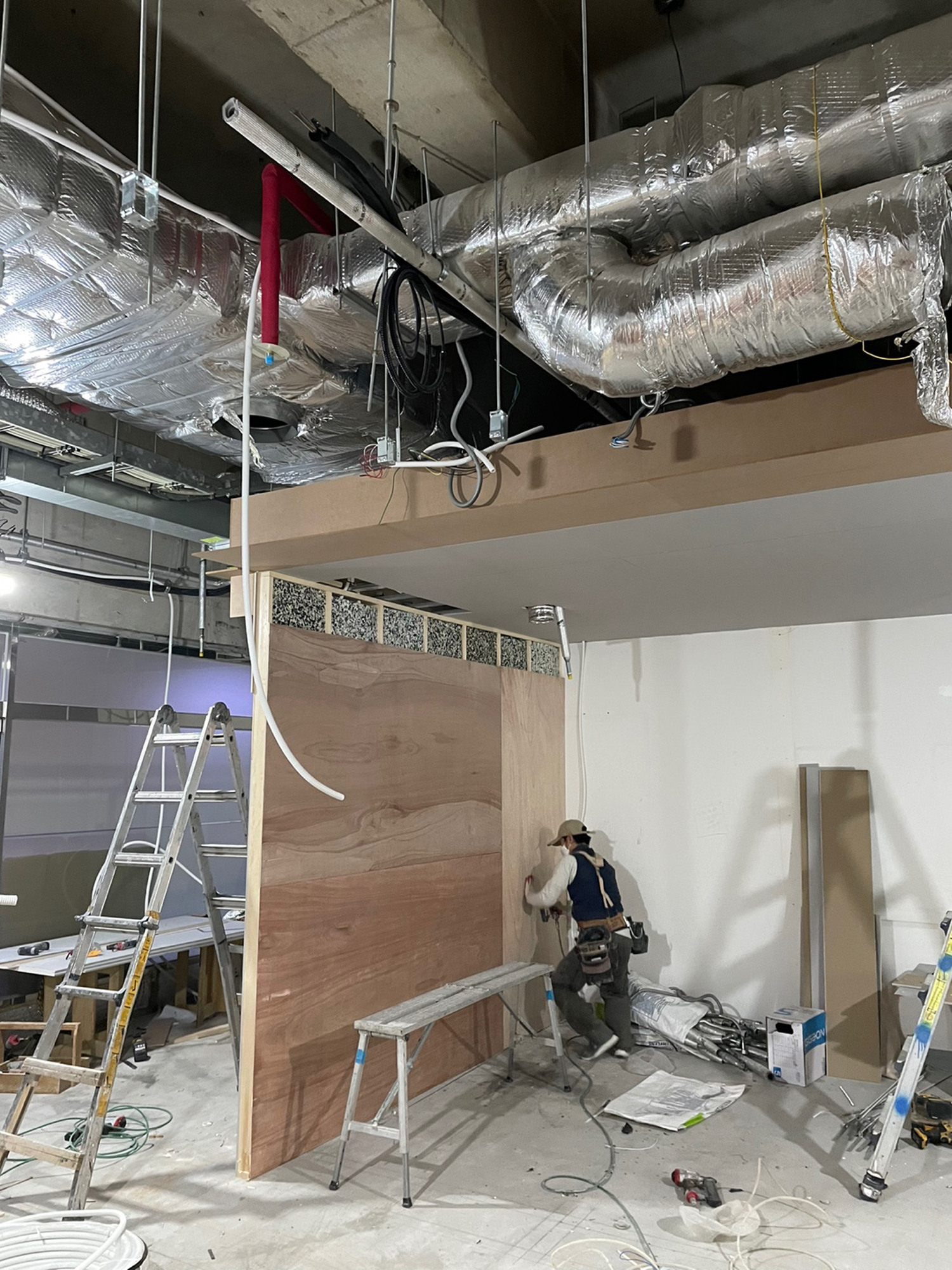 내부에 들어서면 가장 먼저 눈에 들어오는 것은 노출 천장의 색상입니다. 개방감을 높이기 위하여 높은 천고의 천장 노출형태로 진행하였는데요. 전체 화이트가 아닌 청록색의 컬러감으로 트렌디하면서도 다른 현장과는 차별화 된 연출을 시도하였습니다.