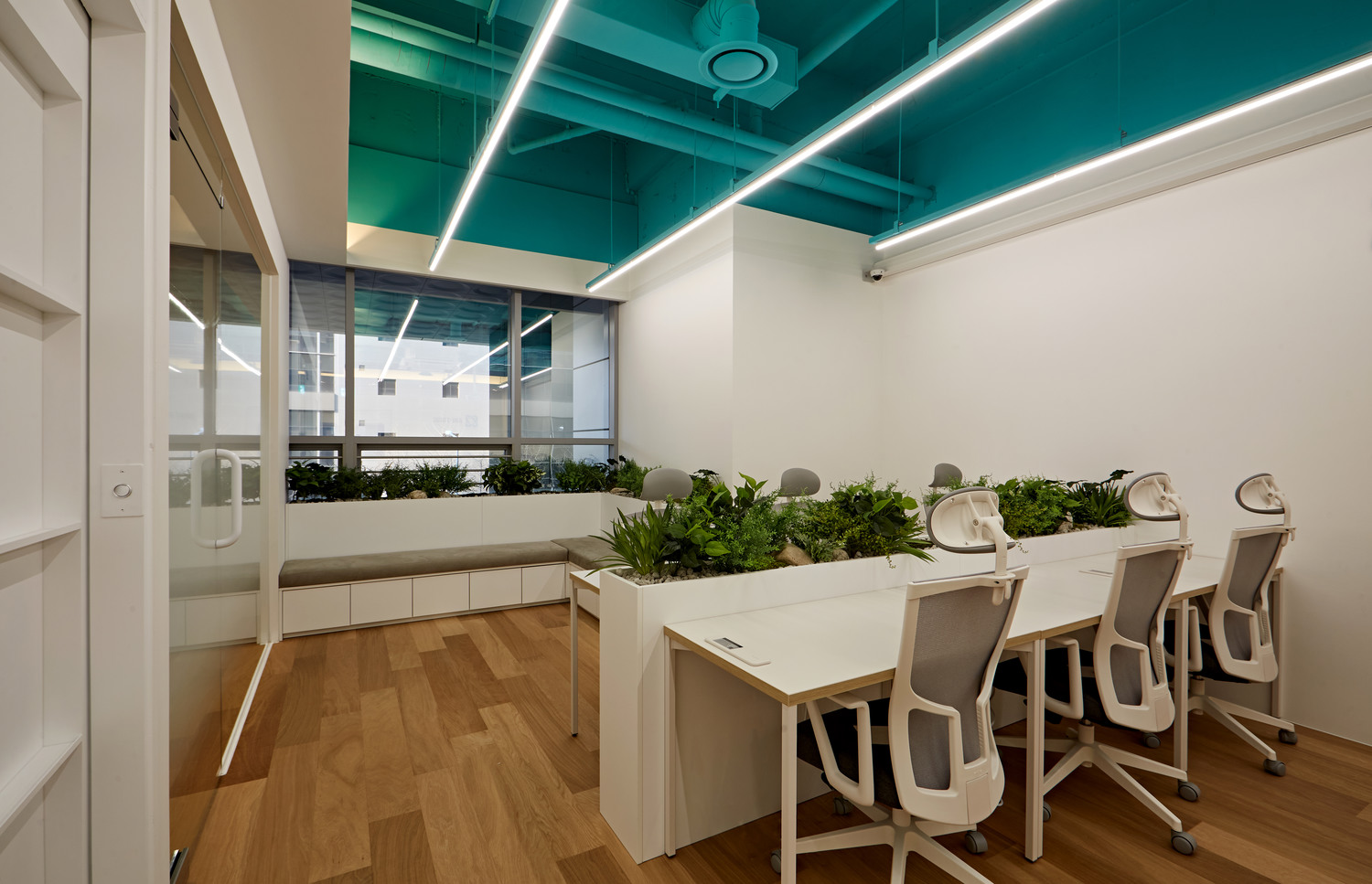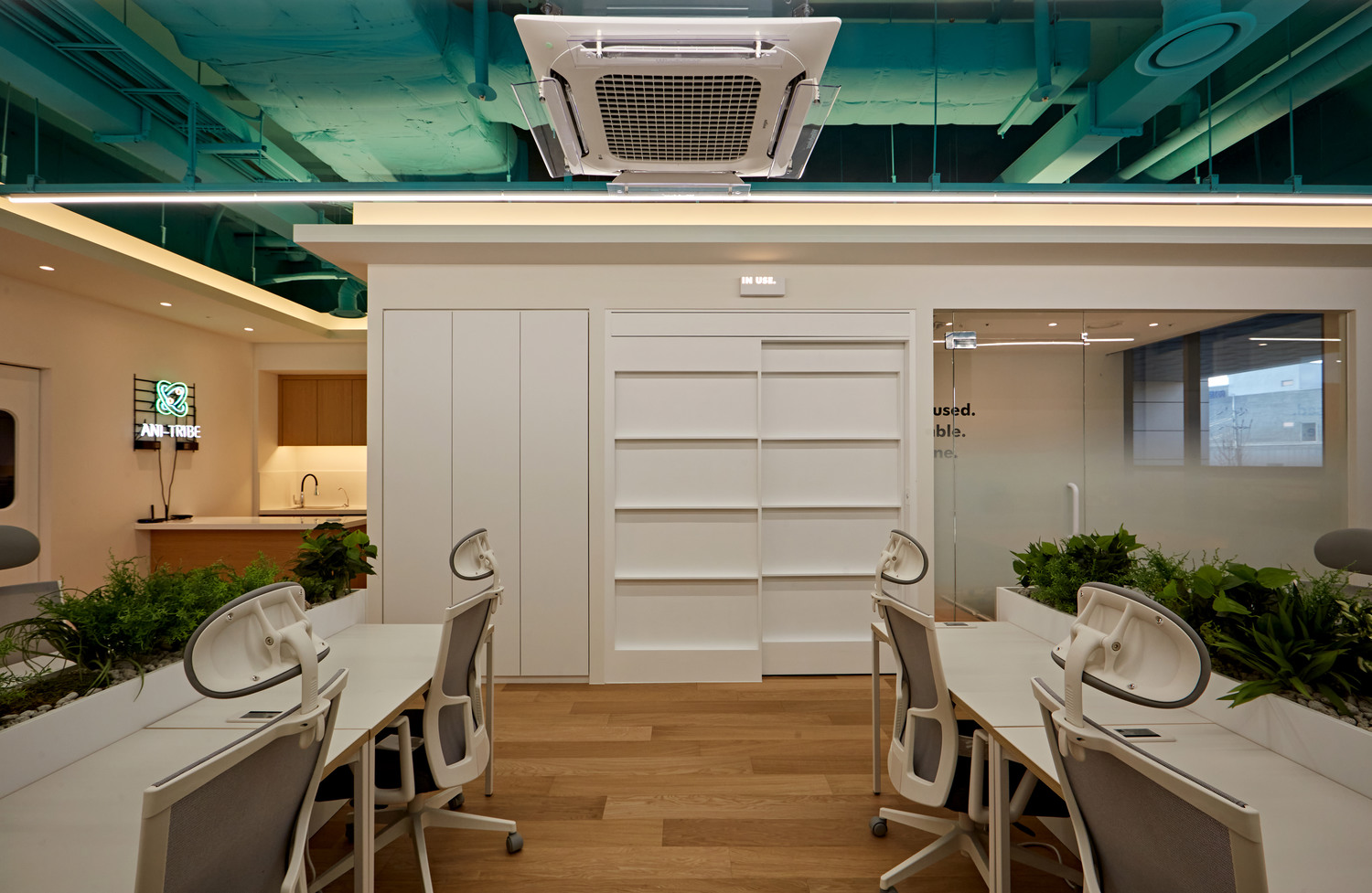 또한 라인 조명으로 넓은 공간을 효율적으로 밝게 비추었으며 깔끔한 톤의 화이트 책상들 사이에는 정적인 파티션이 아닌 플랜테리어를 마치 파티션처럼 활용했는데요. 덕분에 더욱 화사하고 아늑한 수원 동탄 사무실인테리어가 완성되었습니다.