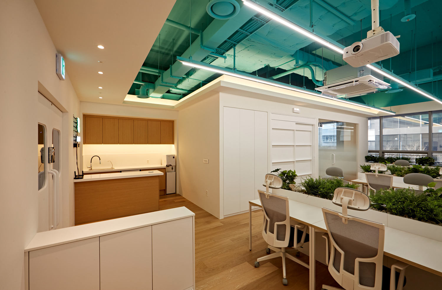 공간이 ㄱ자 구조로 되어있는 수원 동탄 사무실인테리어는 동선의 복잡함을 줄이고 효율적인 활용에 중점을 두었는데요. 화이트와 원목 그리고 그린 컬러로 컨셉을 잡아 자연친화적이고 집중도가 높아지는 환경이라 할 수 있습니다.