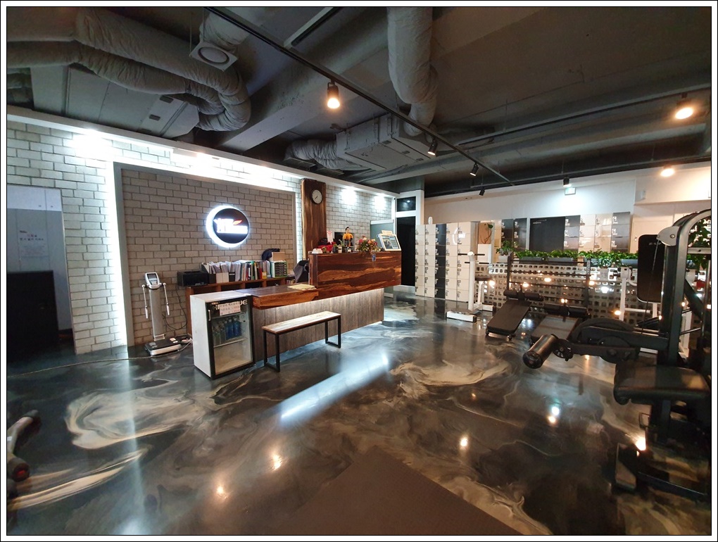 회원을 맞이하고 배웅하는 로비 공간은 인바디를 체크하는 회원상담 공간이면서 라커키를 내주고 받는 인포메이션 공간으로 조성했으며 낮은 선반장을 배치해 충분한 수납이 가능하도록 했습니다. 오픈형의 노출천장으로 시공해 공간이 넓어 보이도록 했고 바닥은 마블느낌의 에폭시로마감하고 벽면은 벽돌 타일로 마감해 인더스트리얼 느낌이 나지만 무채색을 적용해 심플 모던 컨셉트를 구현하고 있습니다.
