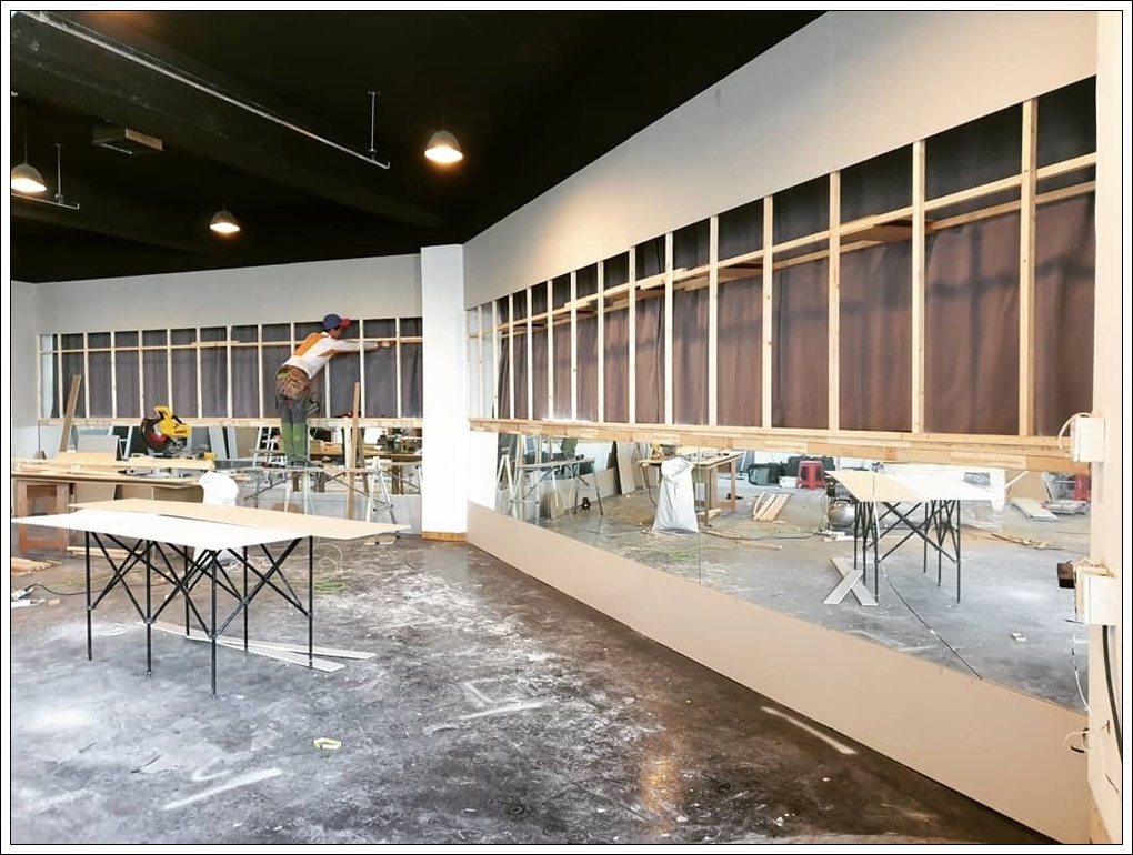 이번 현장에는 벽면에 거울을 시공하되 꺽이는 부분이 있어 그 위치의 기둥을 살리면서 프레임이 보이지 않는 디자인을 적용했습니다. 거울은 목공 작업으로 부착하는 바탕면의 뼈대를 튼튼하게 만든 후 그 위에 알판을 부착해 거울을 단단하게 고정해야 합니다.