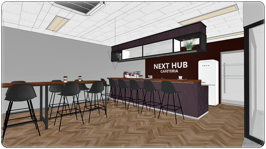 카페테리아 디자인설계도 마찬가지로 아이소 입체도면과 3D 이미지를 함께 제공해드렸습니다. 카페테리아도 그레이톤 벽면과 헤링본 패턴 바닥을 적용해 통일성을 주었고 매립형 조명을 구성해 깔끔하고 높은 층고를 확보했습니다. 가구는 바닥보다 좀 더 딥한 톤의 우드 컬러를 지정했고 ㄷ자 구조의 싱크대는 하부에 템바보드를 계획하면 무거운 분위기를 조금은 경쾌하게 연출할 수 있습니다.