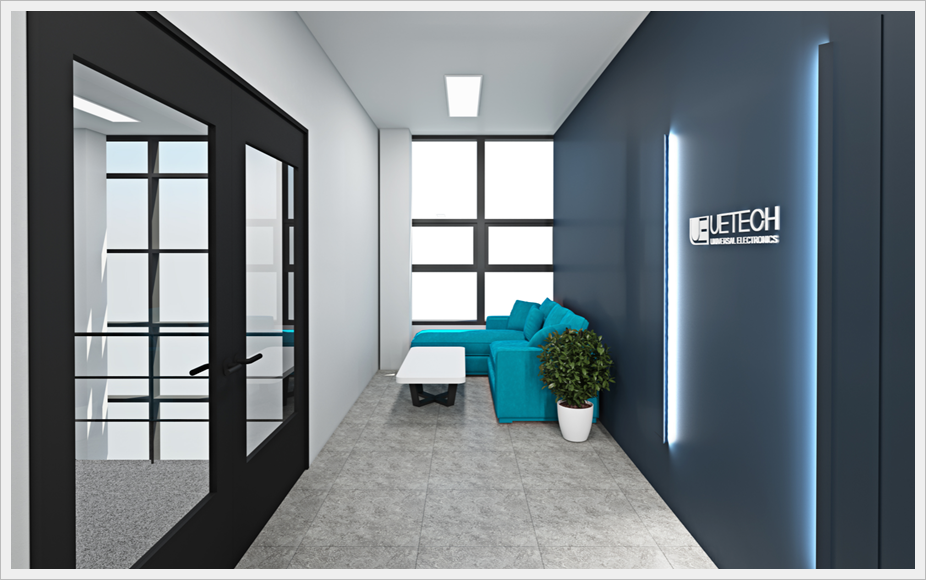 계단을 올라가면서 보이는 정면에는 템바보드를 적용한 경쾌한 이미지월을 계획하고 간접 조명을 더해 화사하게 연출함으로써 회사가 갖는 이미지를 표현했습니다. 입구 파사드는 기업의 첫인상을 좌우할 정도로 중요하기 때문에 회사명과 로고를 설치해 가독성을 높이는 것은 물론 기업의 브랜드 이미지를 자연스럽게 홍보할 수 있는 디자인을 적용하는 것이 좋습니다.