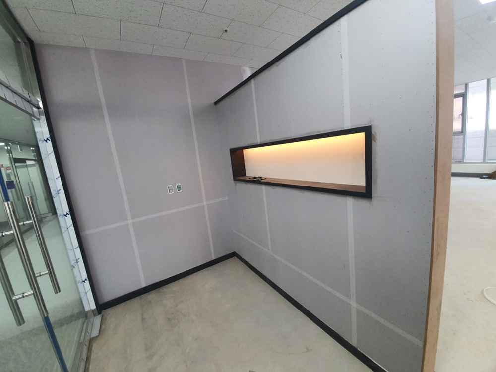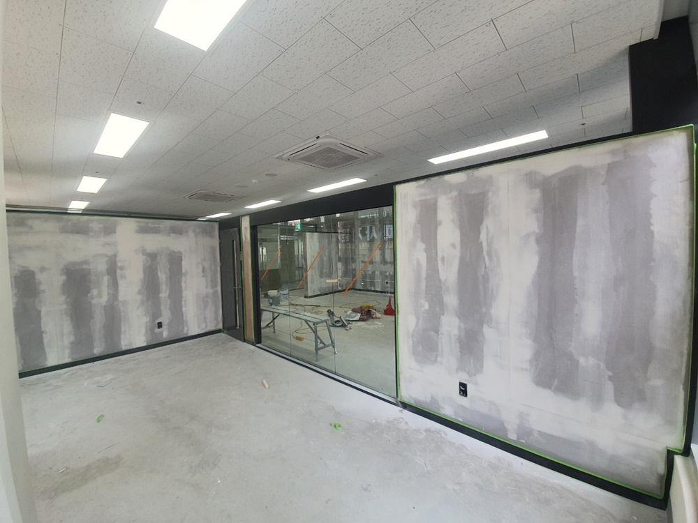 공용사무공간, 대표실, 회의실을 나눠 그에 맞는 가벽을 세우고 파티션을 설치해 공간을 구분하고 동선을 만든 후 벽면 마감을 위한 알판 작업을 진행합니다.