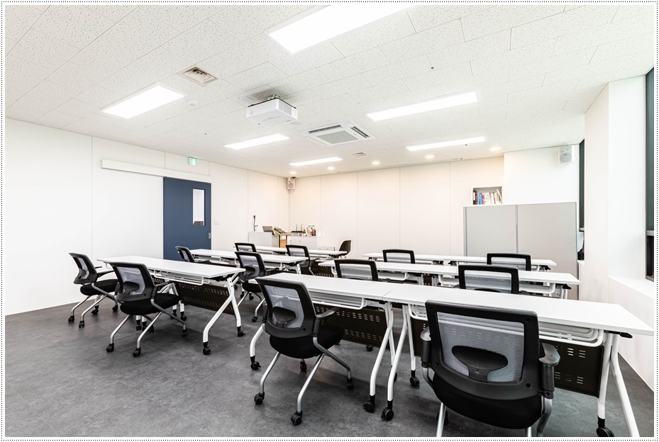 세미나, 강의, 실습 등이 이뤄지는 공간은 충분한 조도를 확보하기 위해 밝은 조명을 시공했고 공간을 활용할 수 있도록 바퀴가 달린 가구를 배치했습니다. 실습 공간은 안전을 위해 테이블간 간격을 충분히 확보했고 벽면에 수납공간을 시공해 사용성과 편의성을 높였습니다.