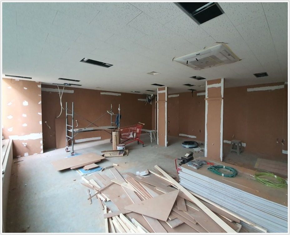 오늘 소개해드릴 현장은 반려동물이 먹는 음식을 만드는 펫푸드 전문학원과 협회가 함께 운영되는 곳이었습니다 그래서 교육장, 세미나실, 조리시설, 사무실 등의 공간을 구성해 공사를 진행했습니다. 우선, 목공 작업으로 가벽을 세워 공간을 나누고 통로, 문 등을 만들고 차음벽을 시공해 옆 공간과의 간섭을 최소화했습니다.