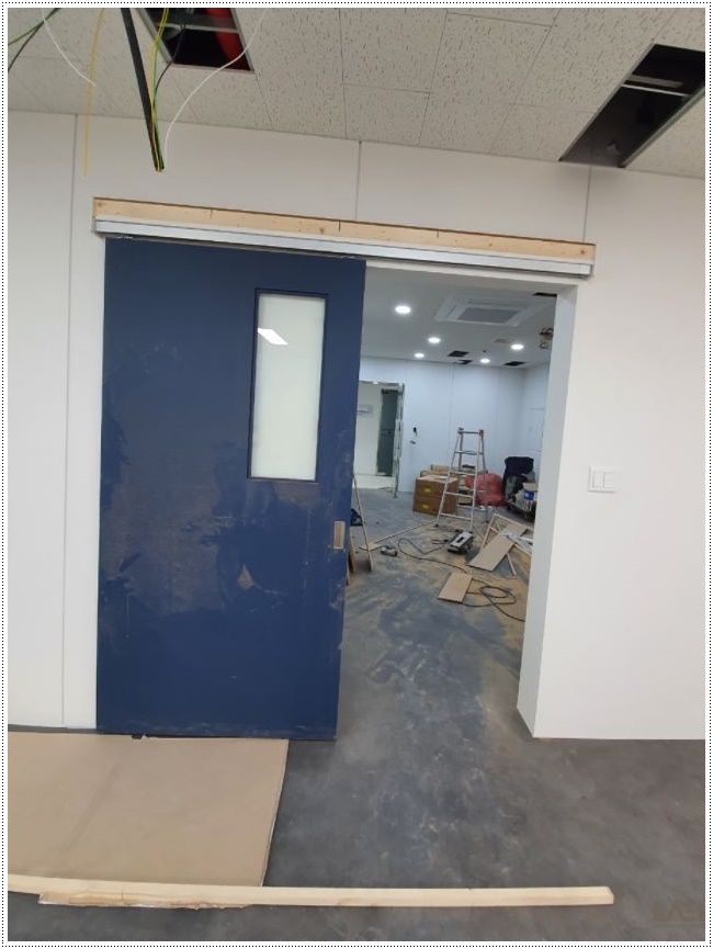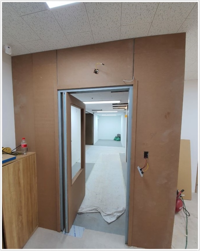 차음재는 외부 소음을 차단하고 내부 소리가 새어나가는 것을 막기 위한 방음 재료인데요, 차음재를 넣고 차례대로 벽면 자재를 부착하면서 전기가 들어가야할 곳의 배선 정리를 함께 해줘야 완공 후 깔끔하게 사용할 수 있습니다. 이렇게 완성된 벽면에 문을 설치해주면 공간과 공간을 드나들 수 있는 동선이 만들어지면서 독립된 공간이 완성됩니다.