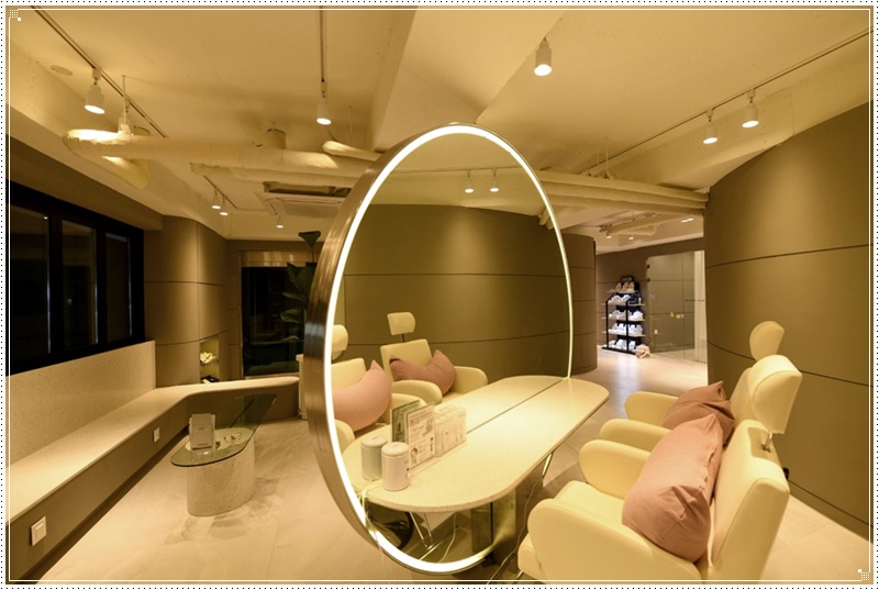 작업공간의 뒷 편에는 이렇게 휴계 공간이 있습니다. 작업공간에 있는 동그랗고 큰 거울을 이용해서 공간의 분리성을 표현하는 것이 가능하였습니다. 다른 휴계공간과는 달리 길고 끝이 뭉툭한 기역자의 쇼파는 우아한 분위기의 뷰티샵에 한층 더 어울리는 가구 배치이기도 합니다. 또한 공간이 심시하지 않게 가운데에 테이블을 배치한 것은 자칫하면 밋밋해보일 수 있는 공간을 한층 더 꾸며주고 있습니다.