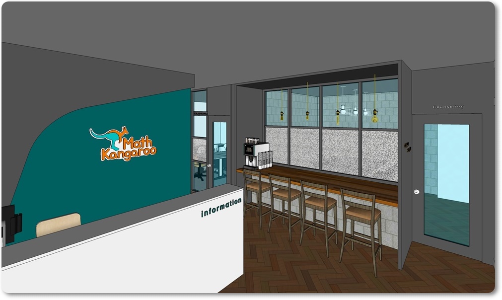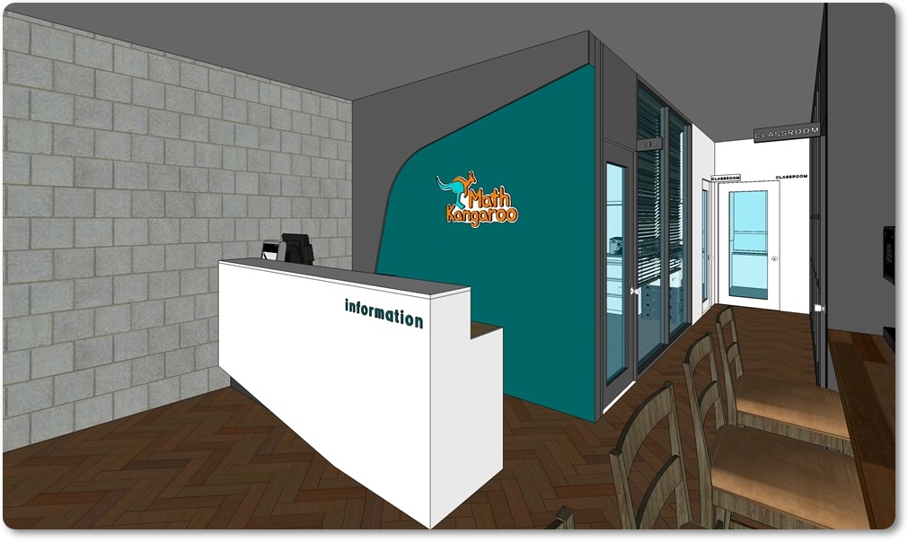 입구 파사드 3D 디자인입니다. 가장 높고 잘 보이는 상단에 간판을 계획해 학원명과 로고를 정확하고 명확히 인지할 수 있도록 했습니다. 전체적으로 글래스 가벽과 도어로 디자인해 외부에서 봤을 때 내부가 디자인의 기능을 하면서 홍보 및 마케팅의 효과가 있도록 했습니다. 아무래도 꽉 막혀있는 곳보다 밖에서도 훤히 보이는 벽은 개방적이면서 자유로운 분위기를 줄 수 있어 호기심을 자극할 수 있답니다.