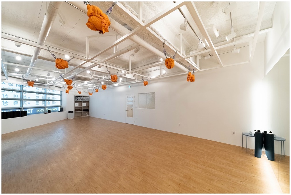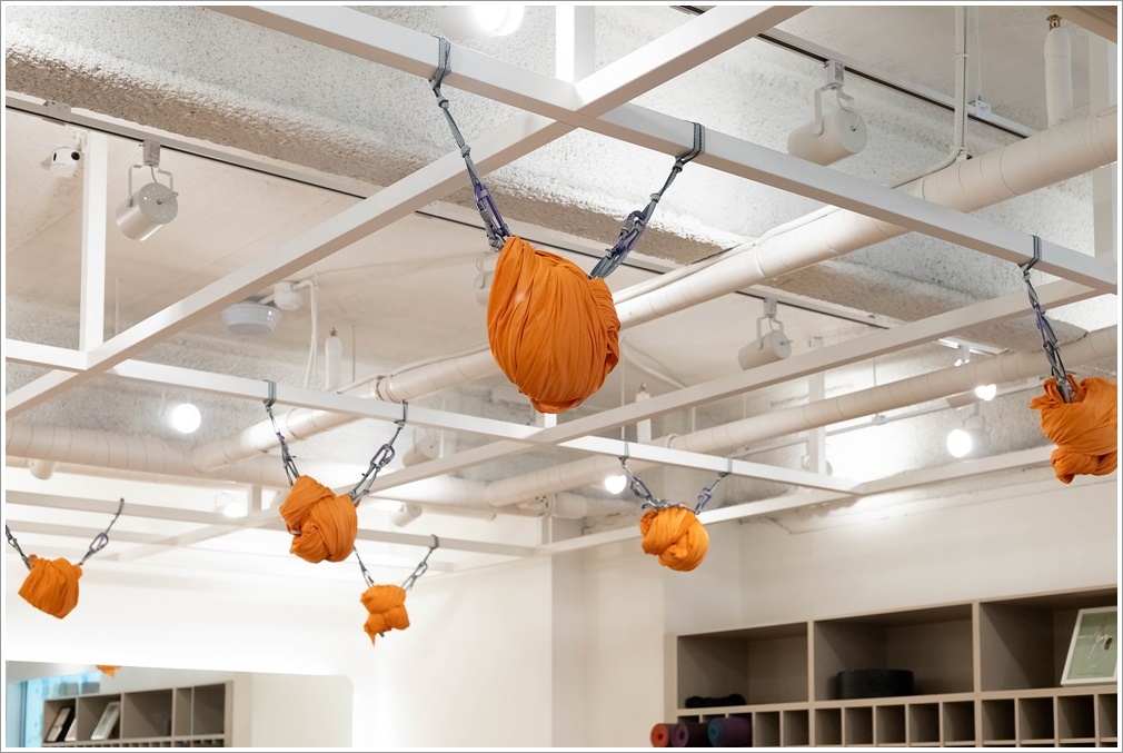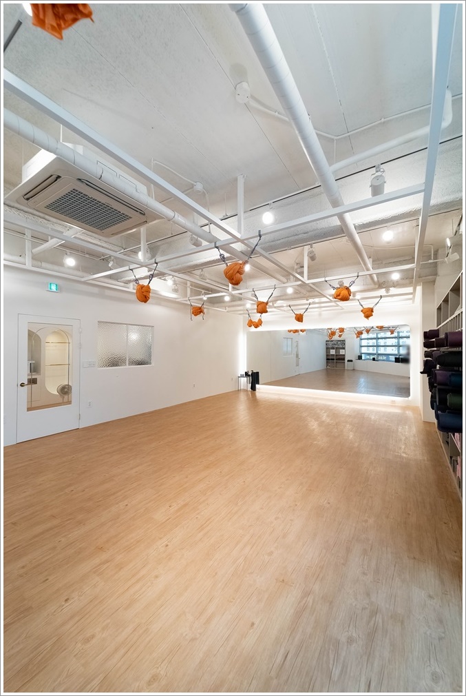 배경은 깔끔한 화이트 컬러로 마감하고 천장은 노출 천장으로 시공해 층고를 확보했고 철제 프레임에 플라잉 요가를 할 수 있는 천을 시공해 다양한 프로그램을 운영할 수 있도록 했습니다. 수업이 이뤄지는 정면에는 거울을 시공해 동작을 점검할 수 있도록 했고 옆 벽면에는 수납장을 시공해 용품 정리를 깔끔하게 하도록 했습니다.