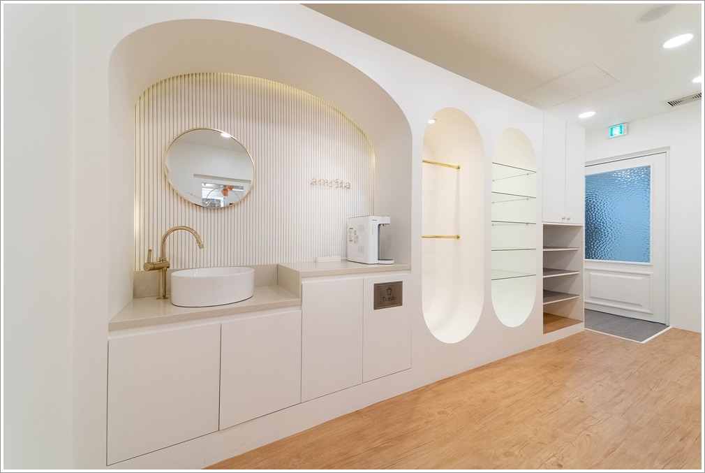 이번 현장은 내추럴한 분위기의 인테리어를 적용한 요가원으로 들어가는 입구 파사드와 내부 인테리어의 디자인에 화이트와 우드를 적용해 통일성을 주었습니다. 깔끔한 화이트를 베이스로 골드 메탈을 매치해 심플하고 고급스러운 분위기를 연출하고 있는데요,