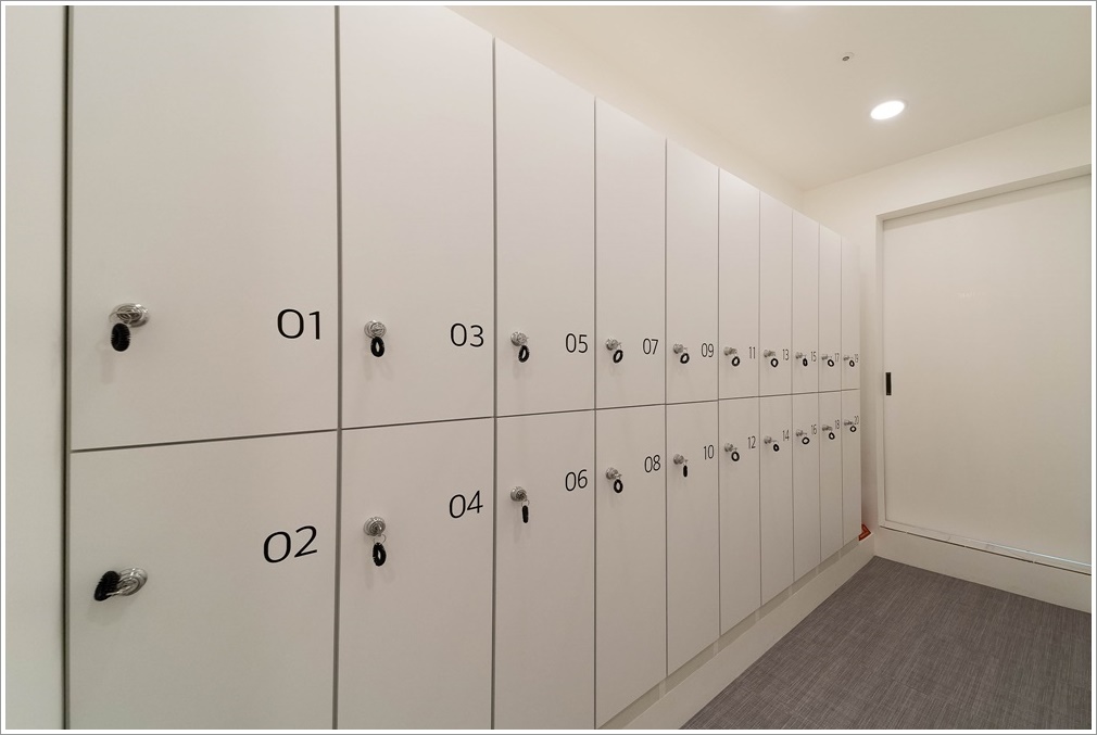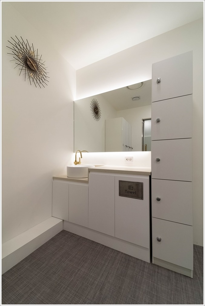탈의실 역시 화이트로 마감하고 공용 락커와 개인 락커를 배치해 사용성과 편의성을 높였으며 매무새를 다듬을 수 있는 세면대를 설치해 공간이 더욱 넓어 보이는 효과도 주었습니다. 바닥은 그레이톤 매트로 마감해 물이 떨어져도 바로 스며들 수 있도록 했습니다.