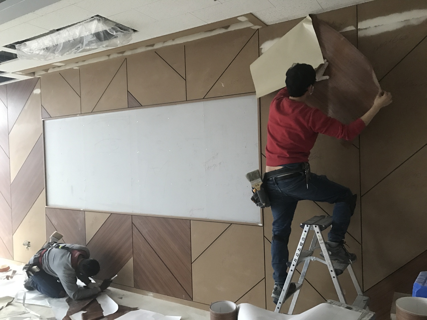 기초 목공 공사를 마무리 후 우드 계열 시트지를 부착하여 따뜻한 느낌의 카페테리아 인테리어를 연출했습니다.