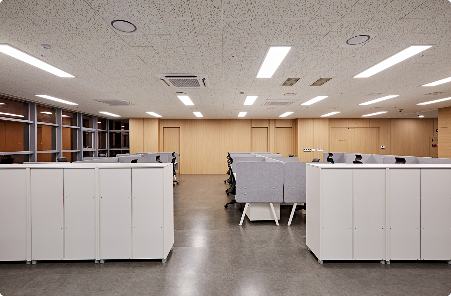 마지막으로 화이트 집기와 그레이 색상의 파티션으로 깔끔하고 세련된 양주 의정부 파주 사무실인테리어 의 업무 공간입니다. 많은 사람이 머물고 일에 집중해야하는만큼 깔끔하면서도 군더더기 없는 스타일로 연출하였습니다.
